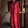 - Fluid kaftan silhouette with dramatic, floor-skimming drape