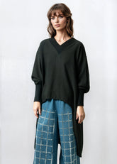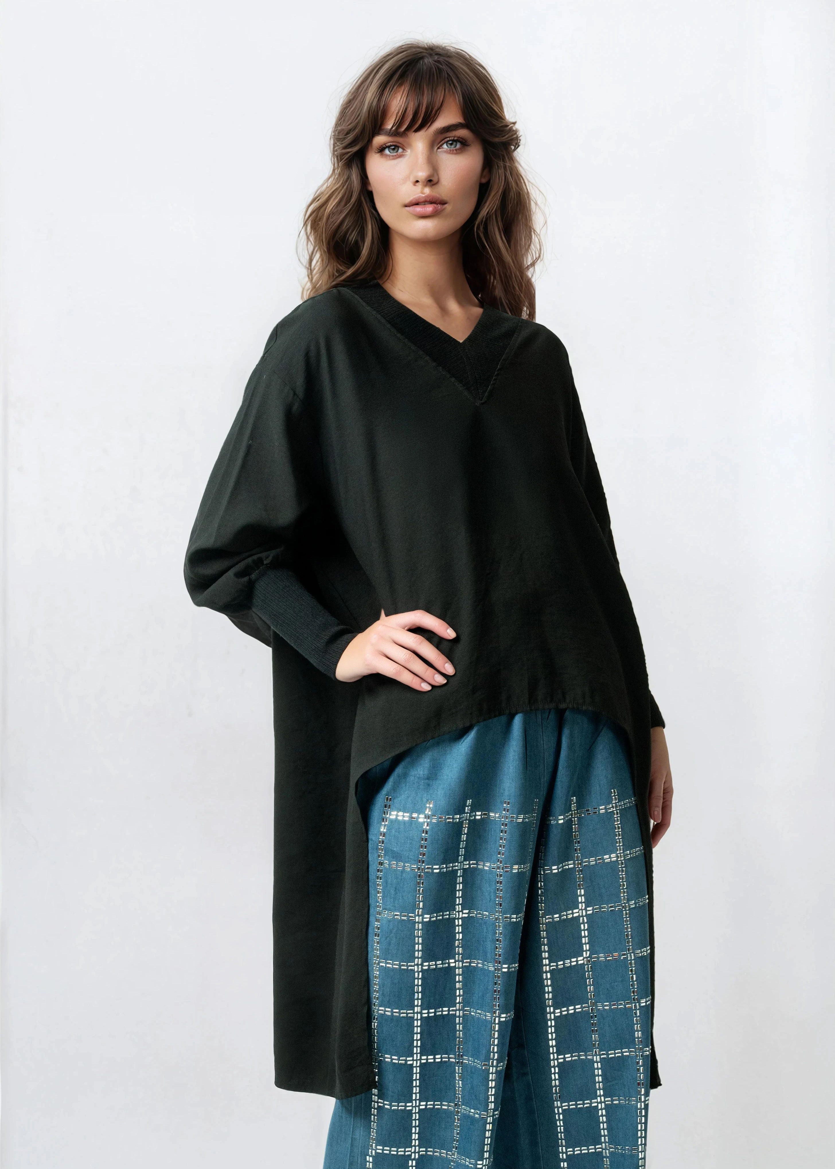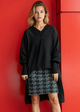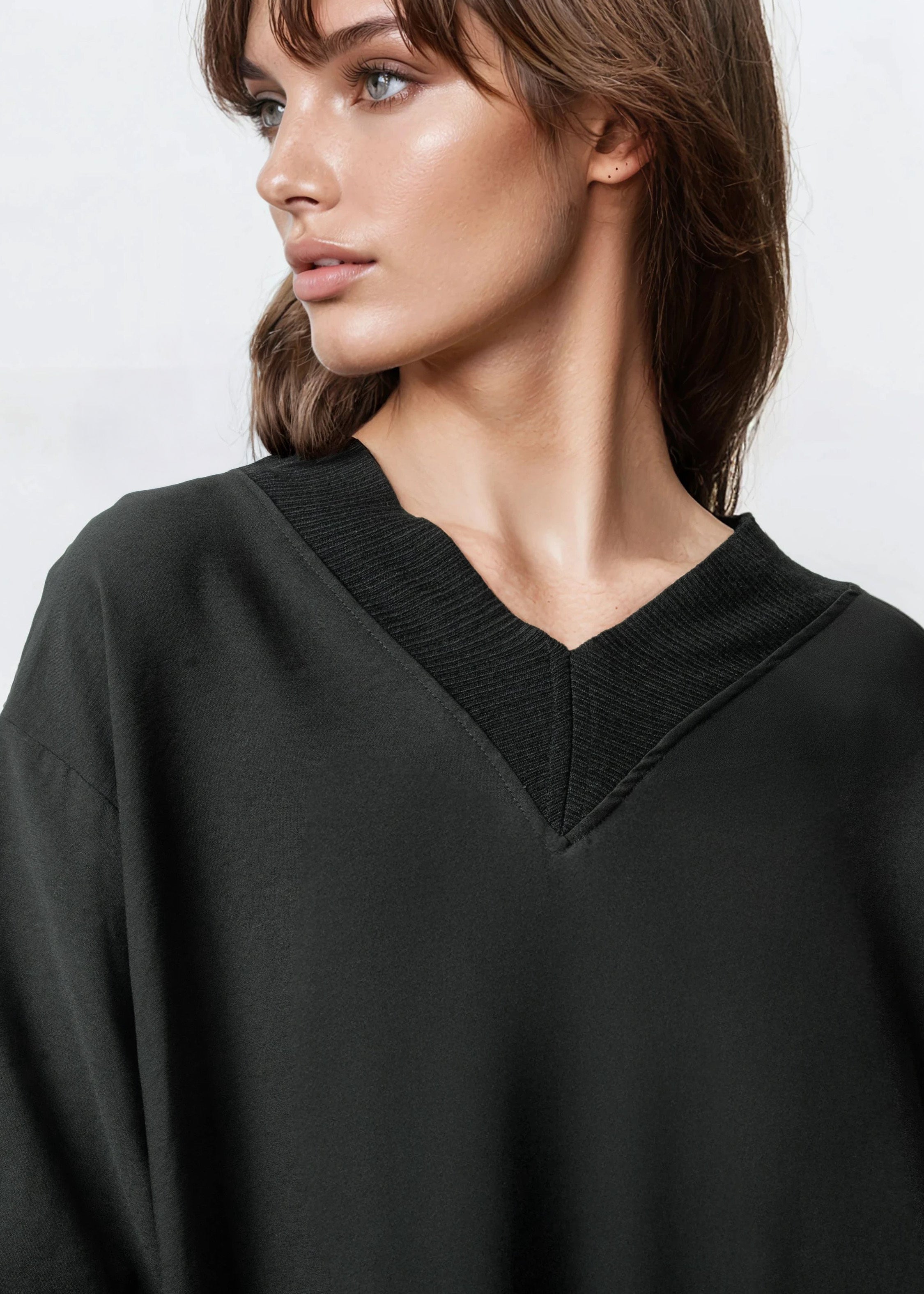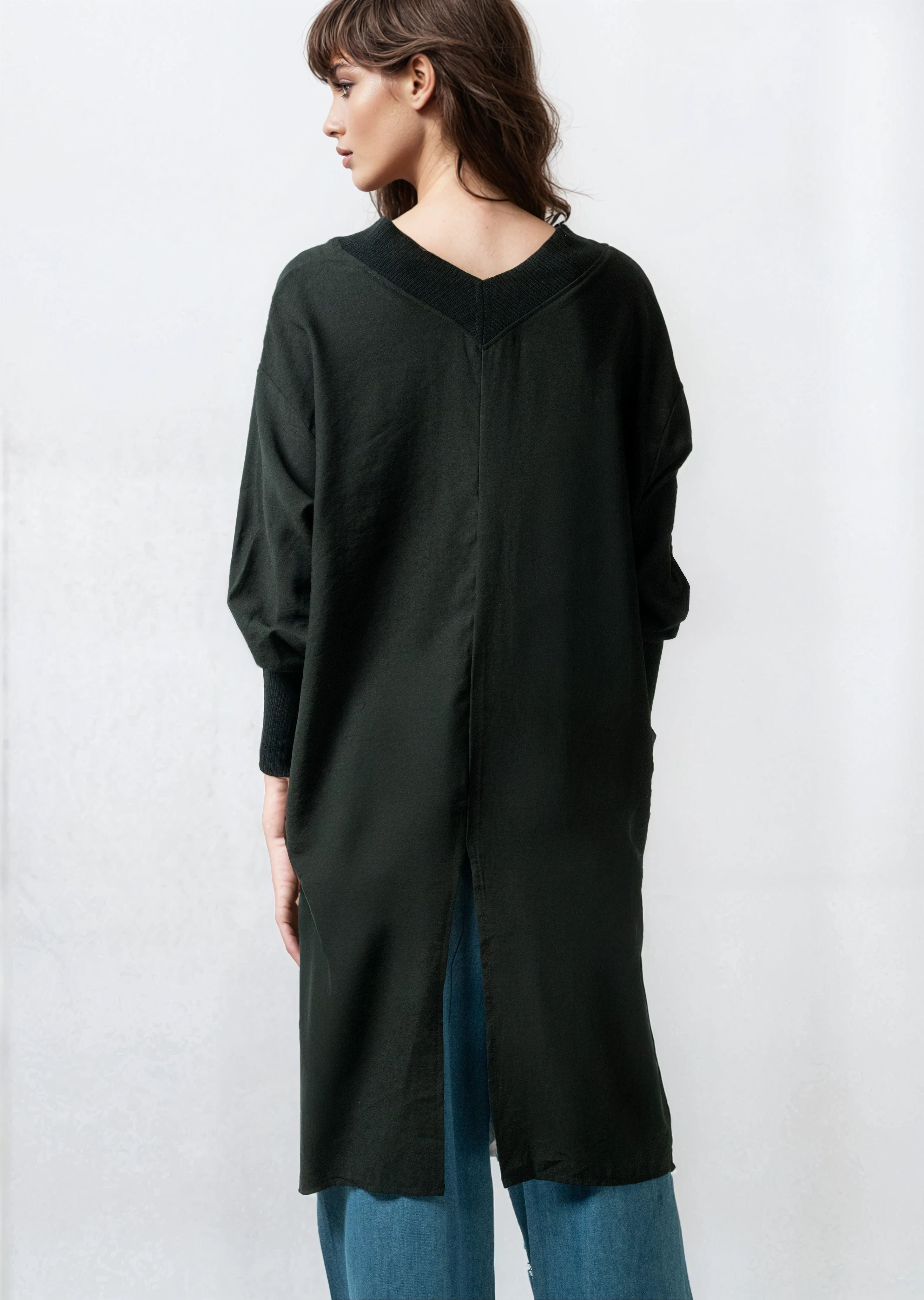 - Relaxed V-neck tunic with contrast rib trim that hits both front and back