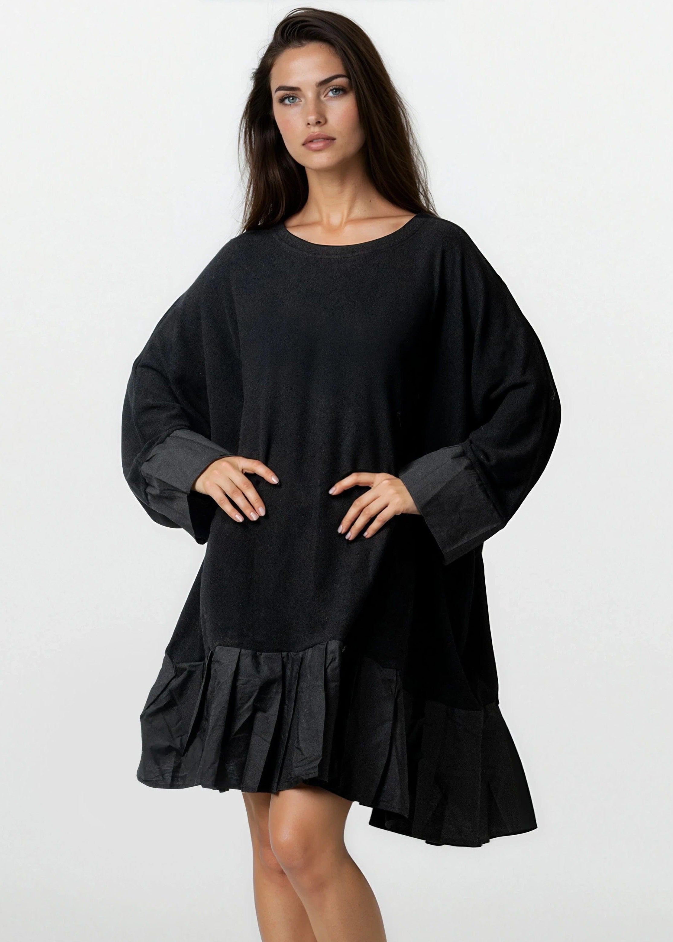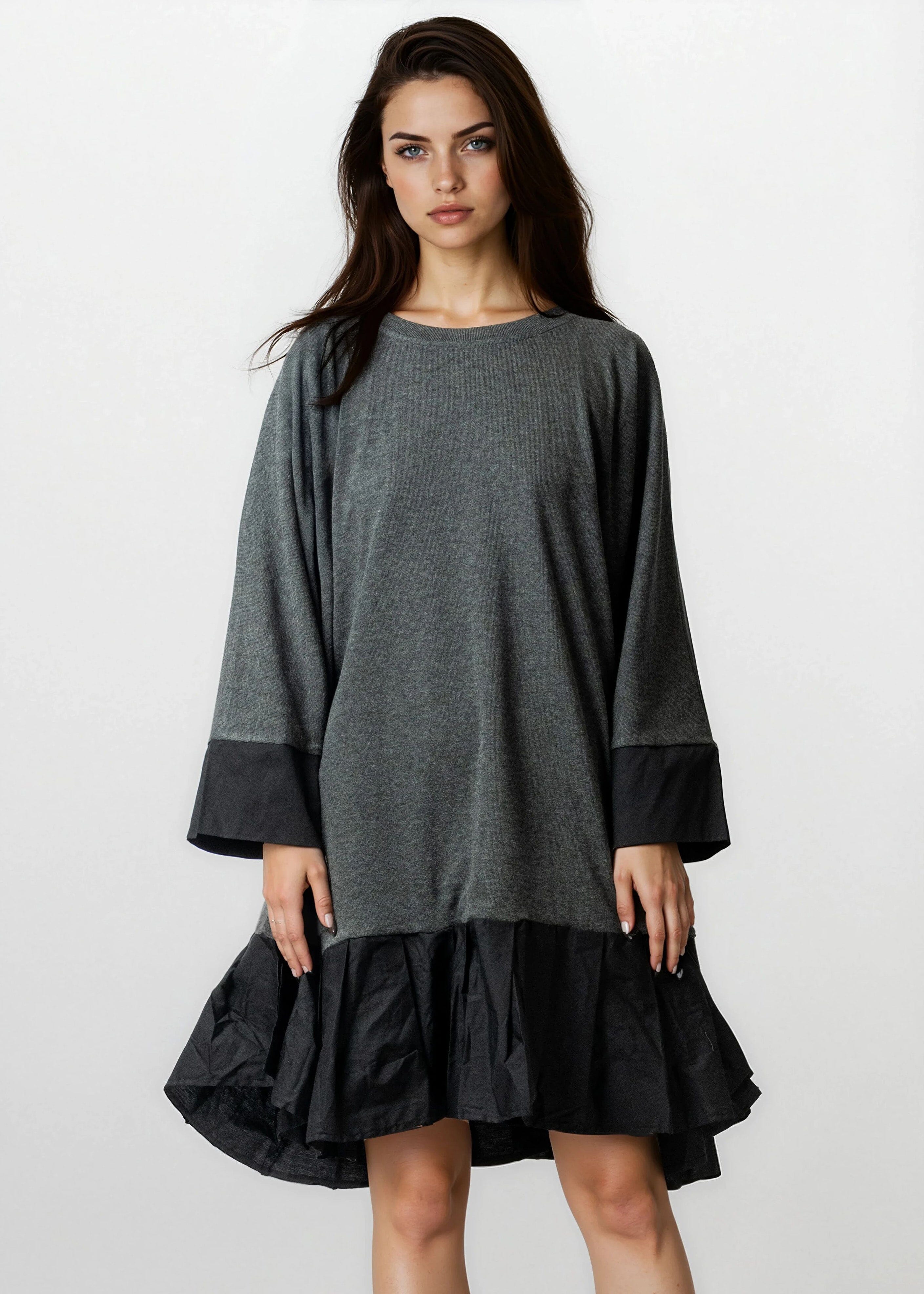 • Oversized sweatshirt-dress energy with a sharp, street-casual attitude