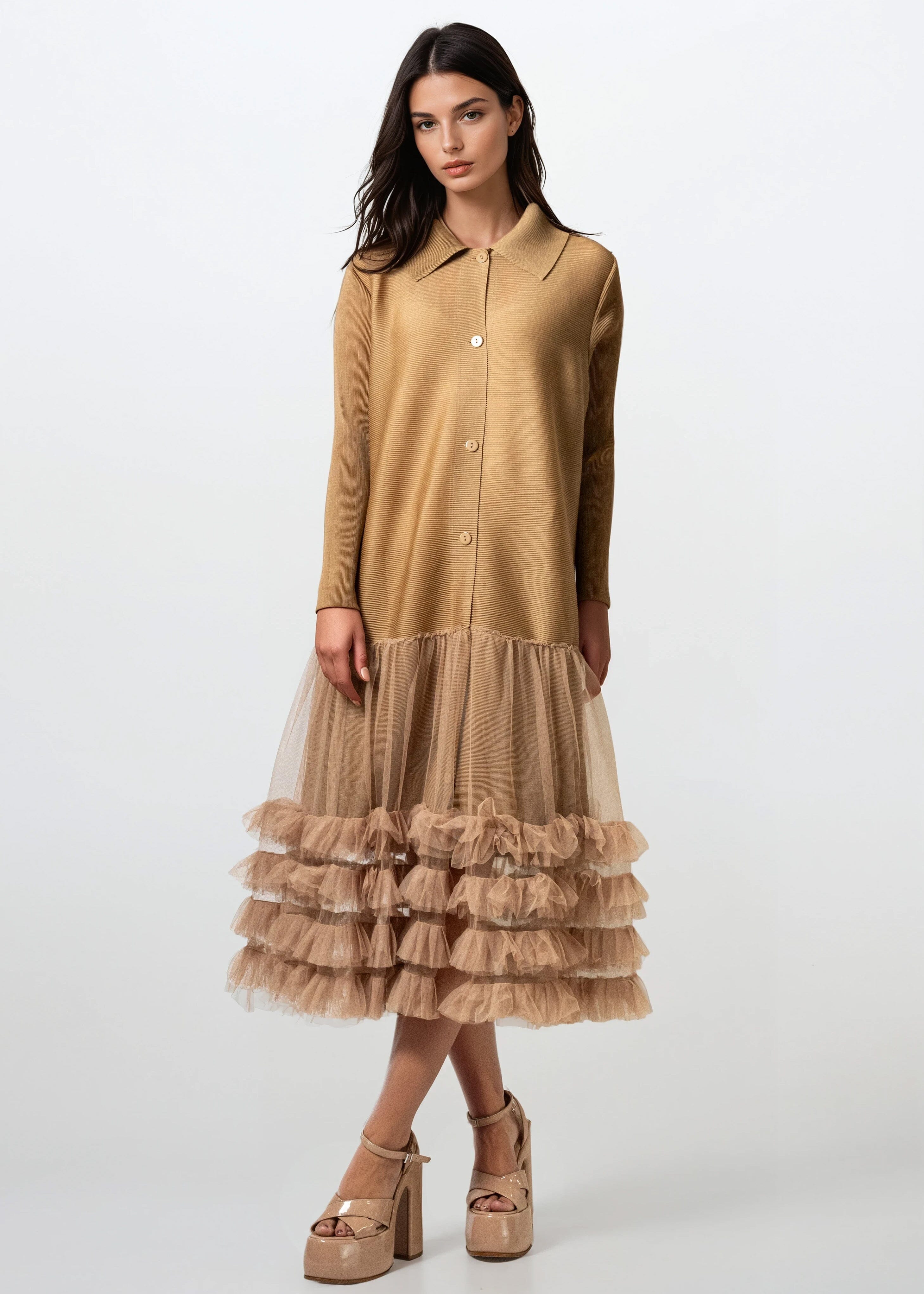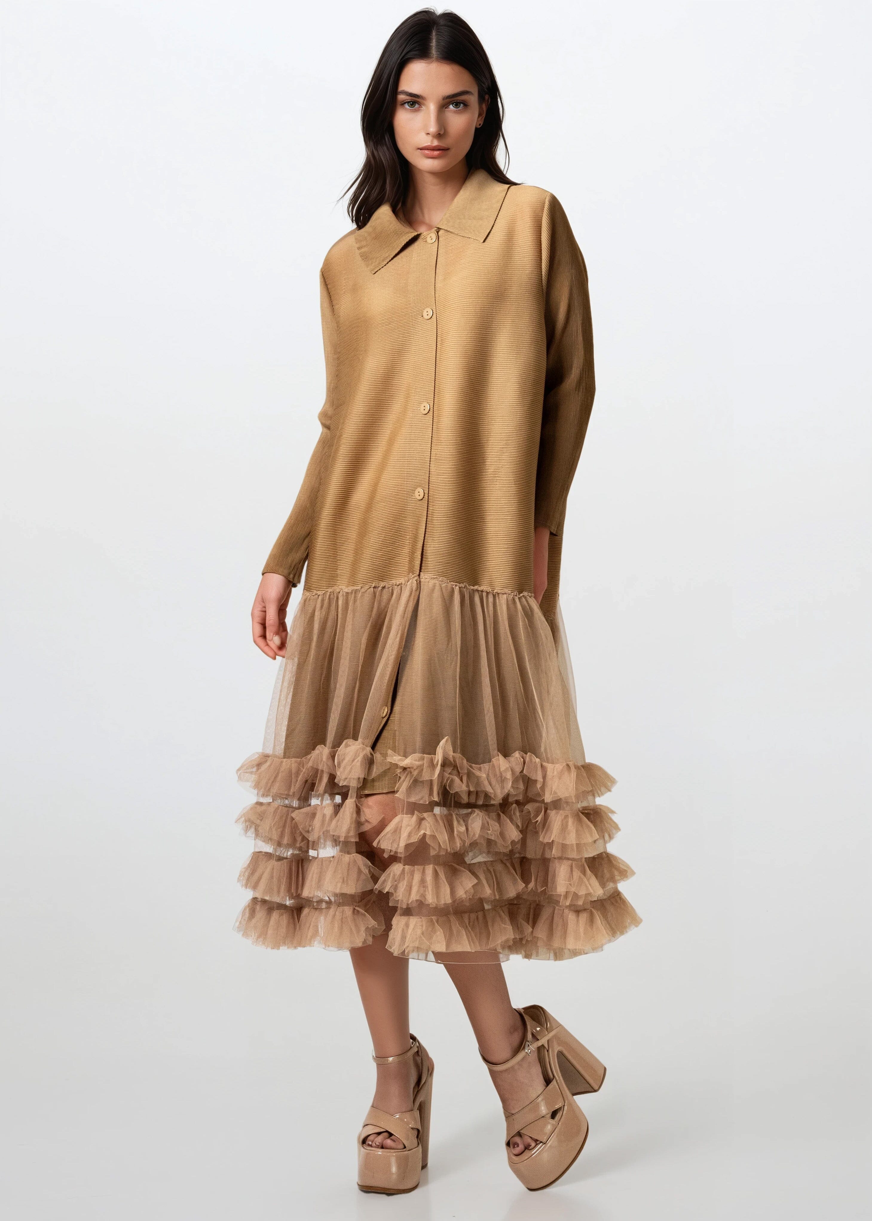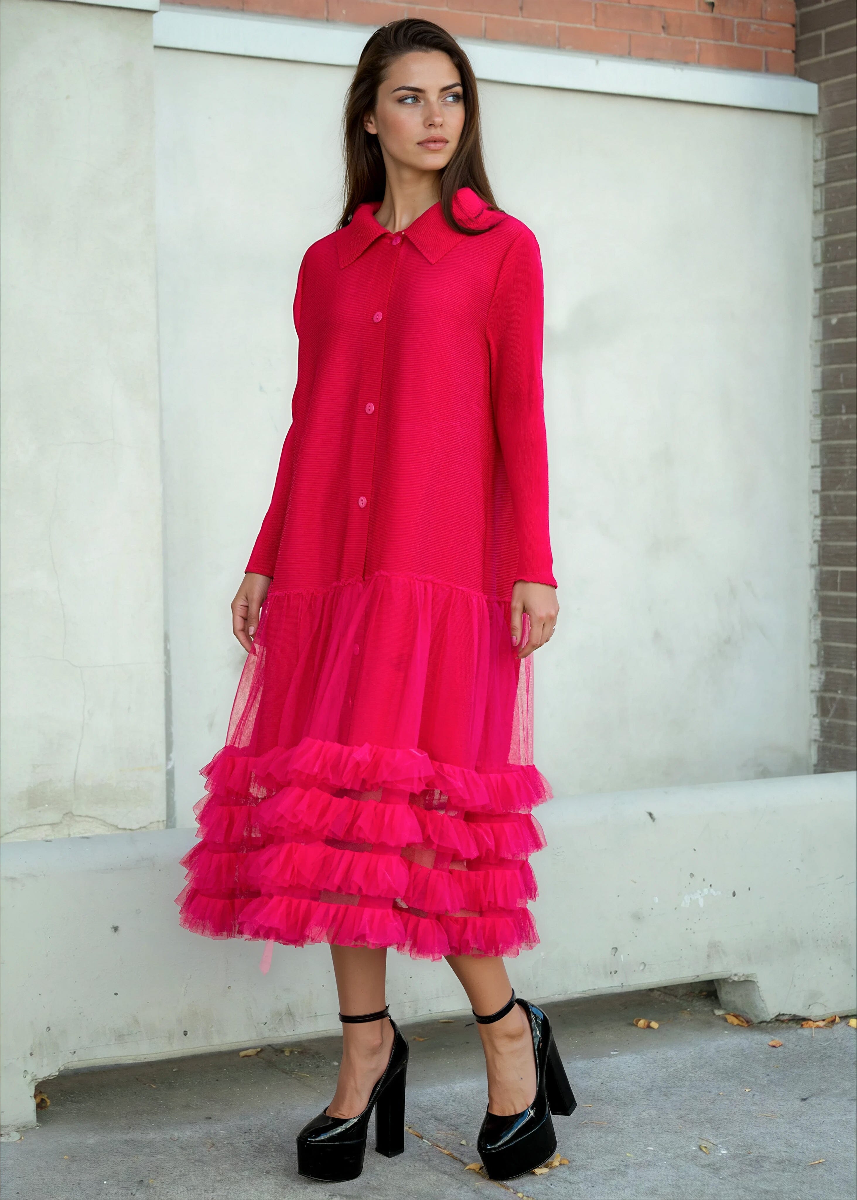 - Crisp button-front shirt dress colliding with a tulle party skirt