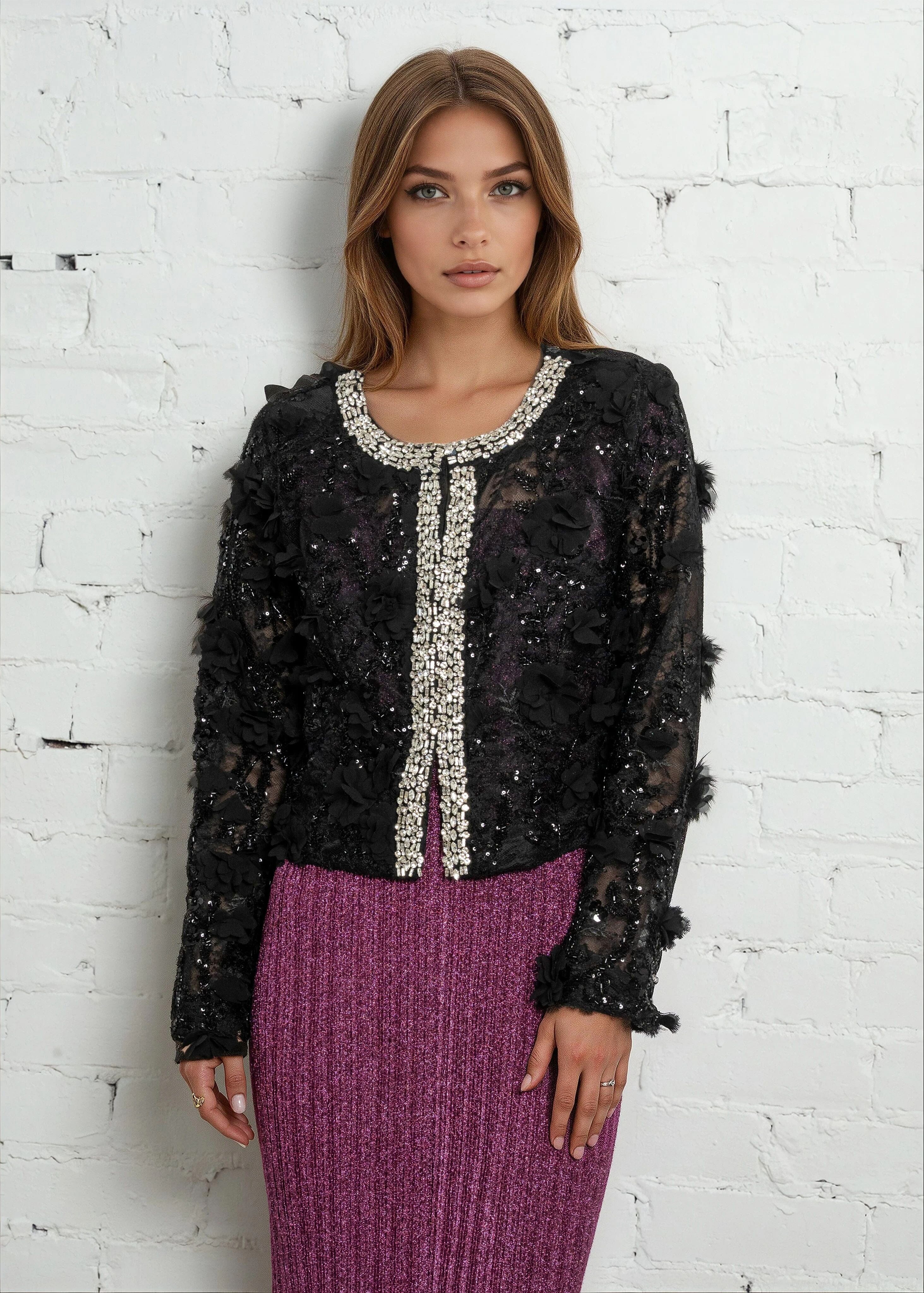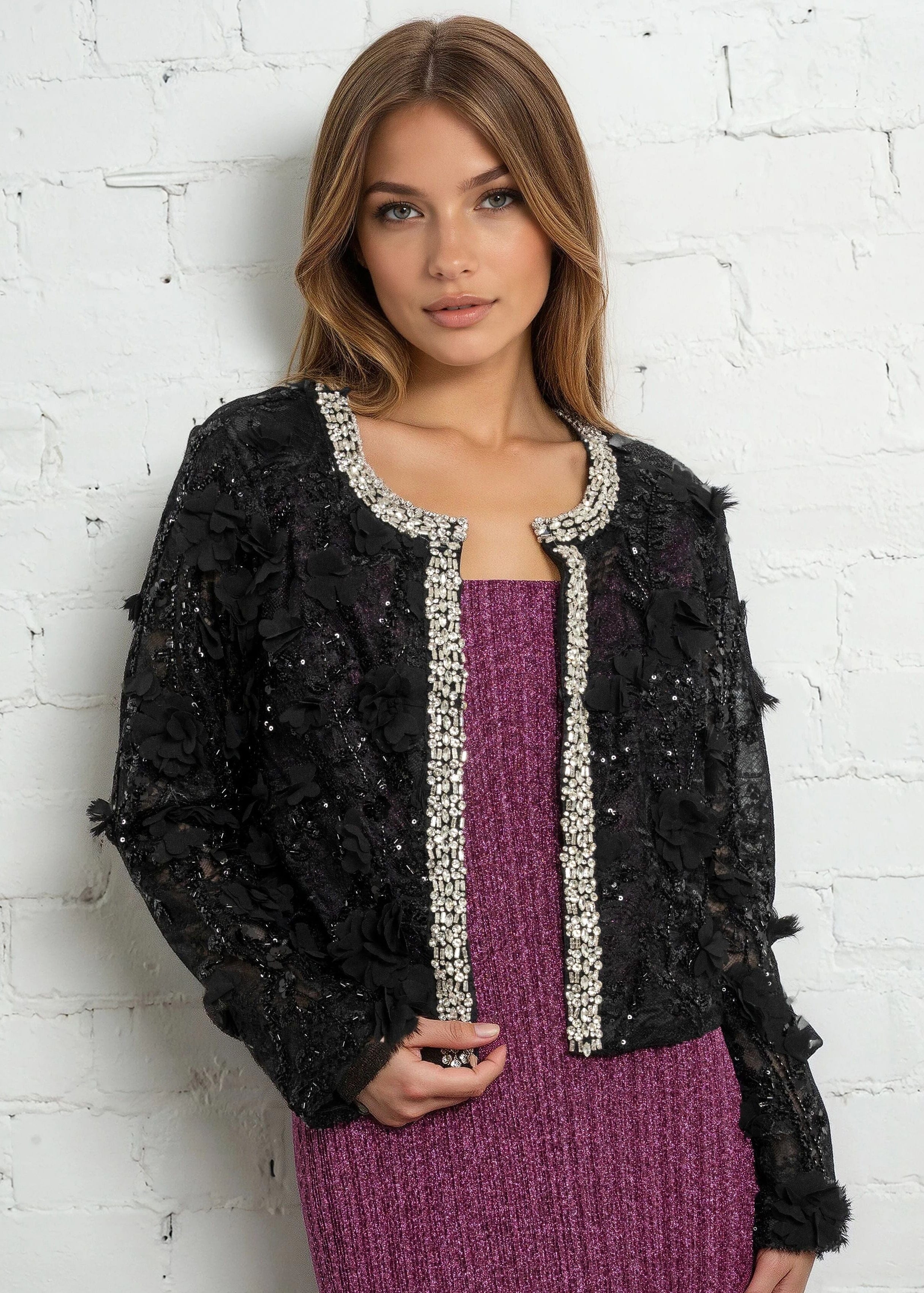 - Sheer lace cardigan with dimensional floral detailing