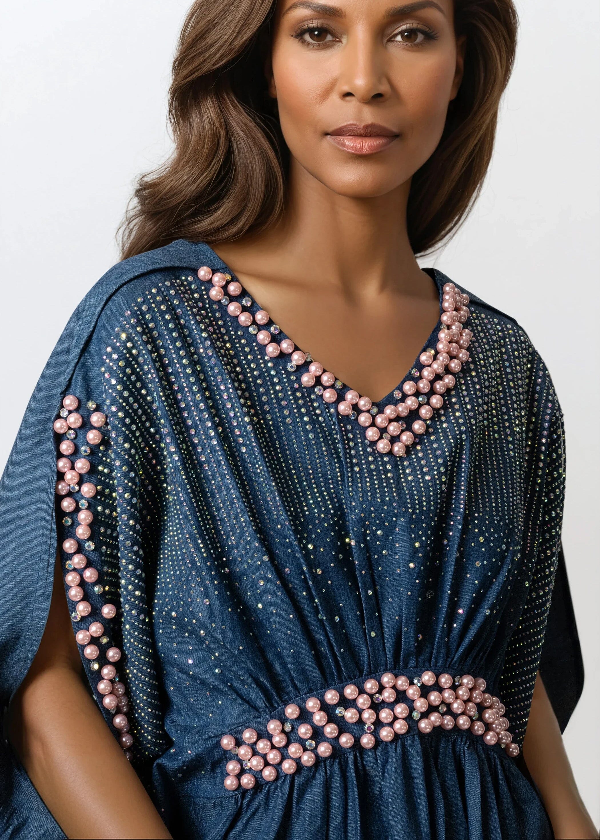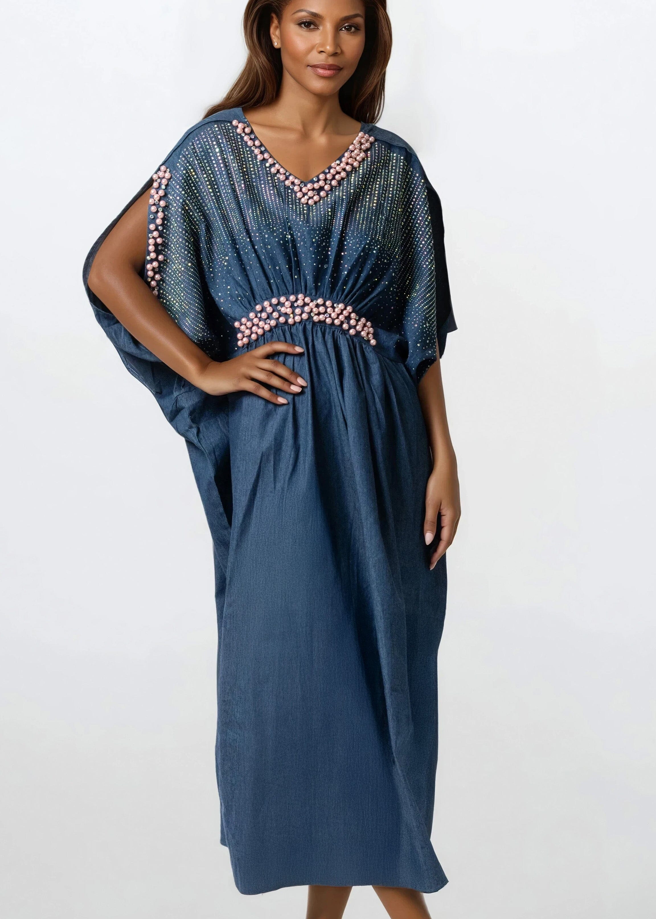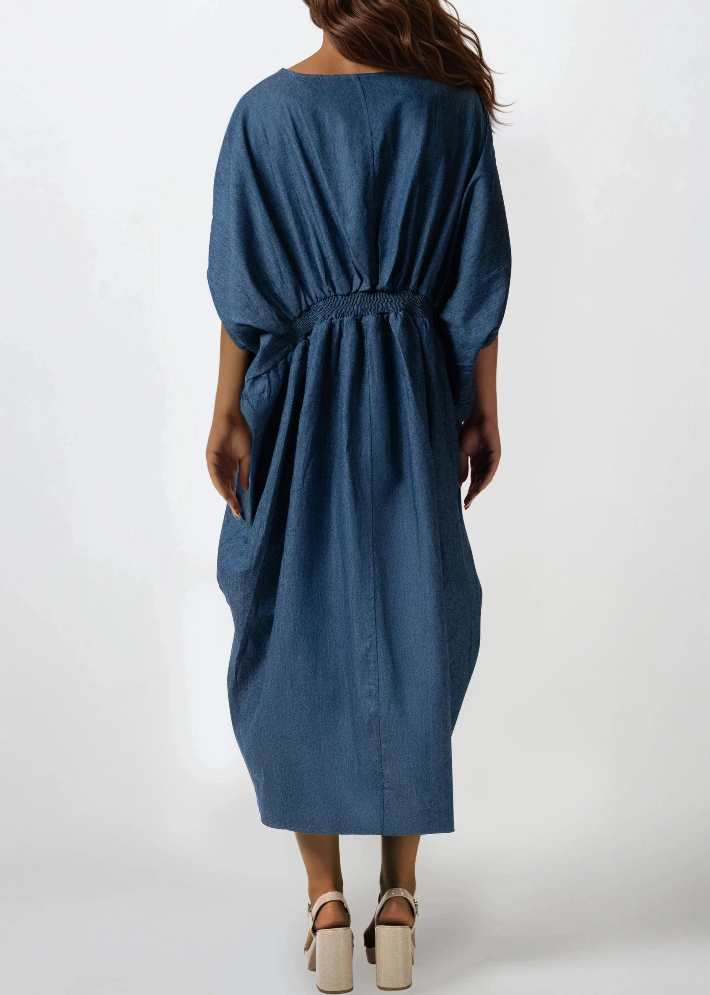 • Statement denim kaftan cut with a loose, flowing silhouette for effortless drama
