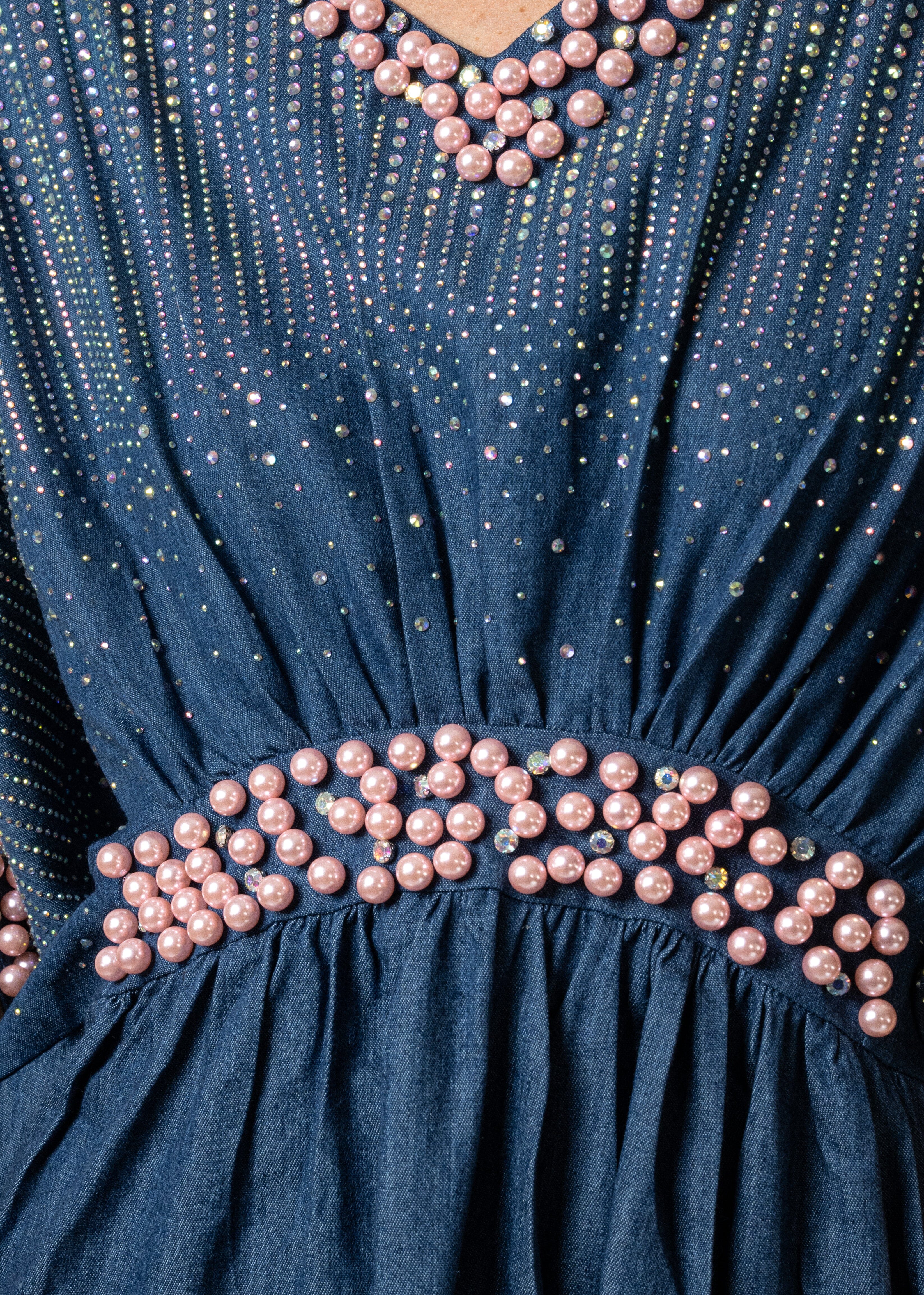 • Deep V-neckline framed by heavy embellishment that draws the eye