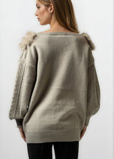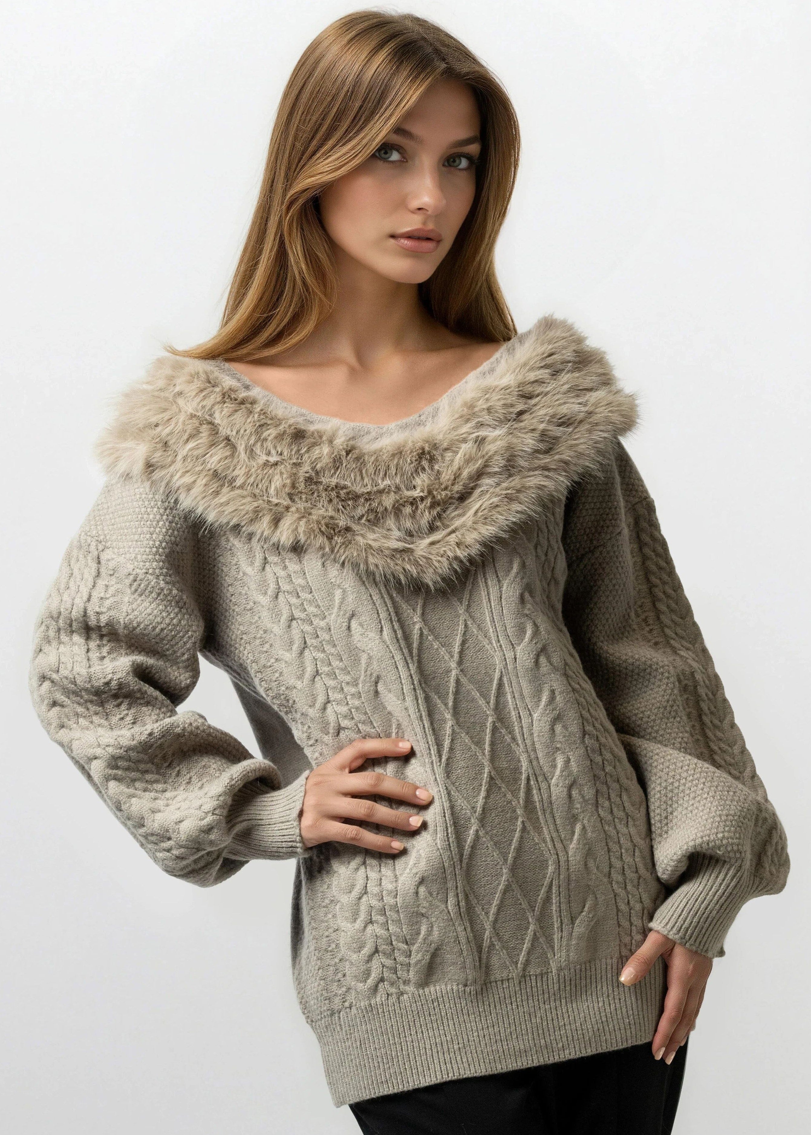 - Cable-knit sweater with a luxe faux-fur trimmed neckline