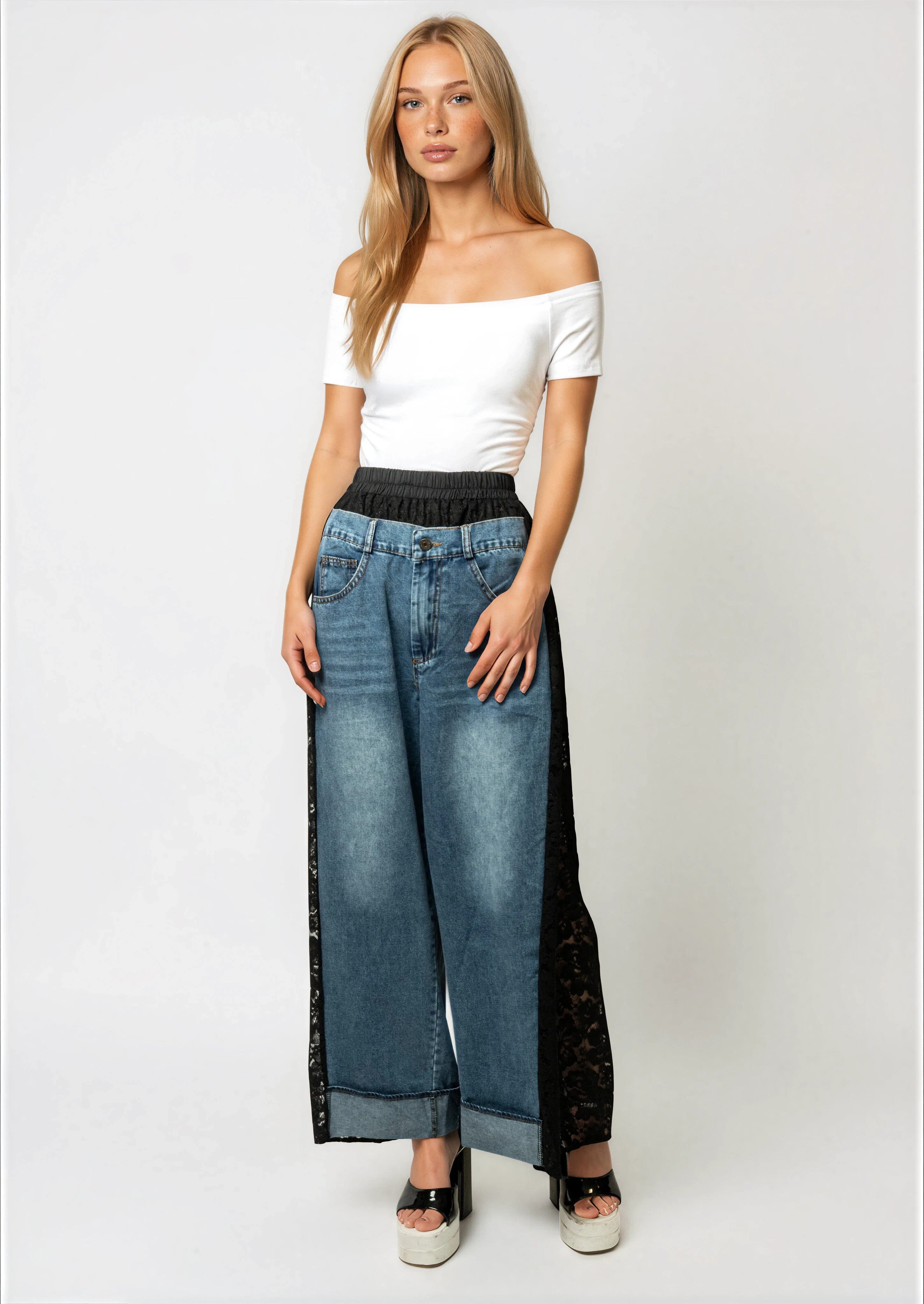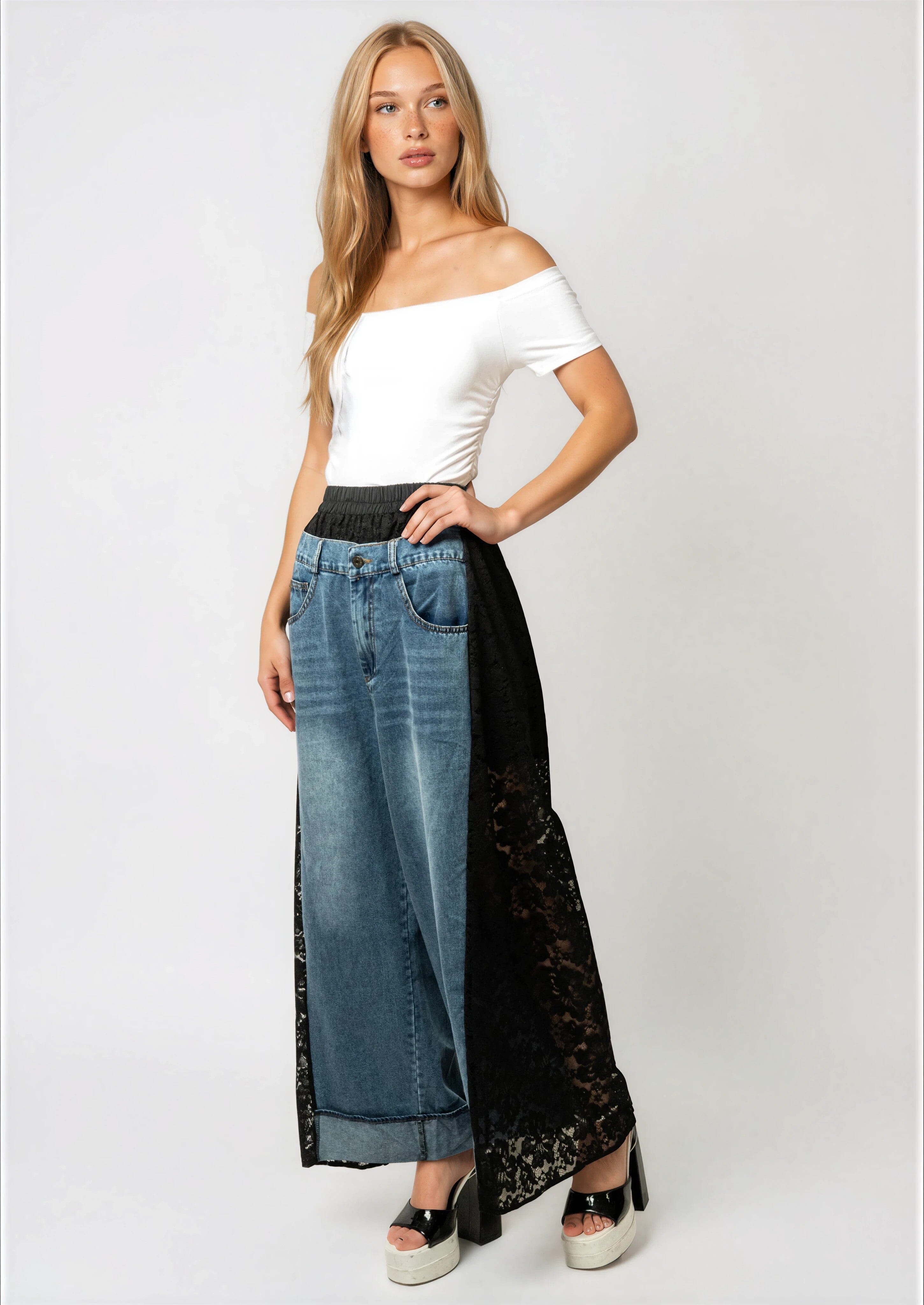 - Washed denim meets sheer lace for an unexpected contrast