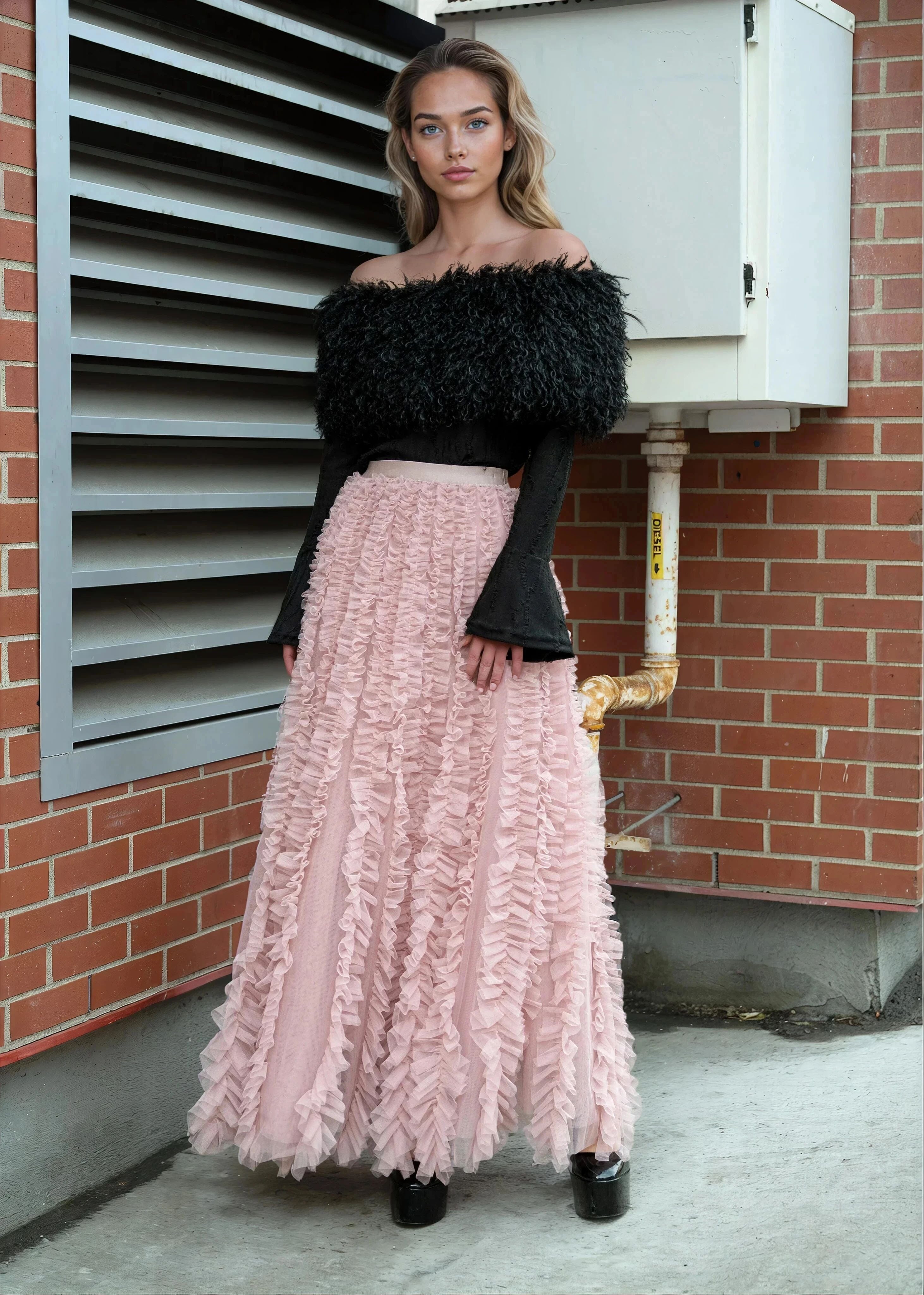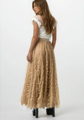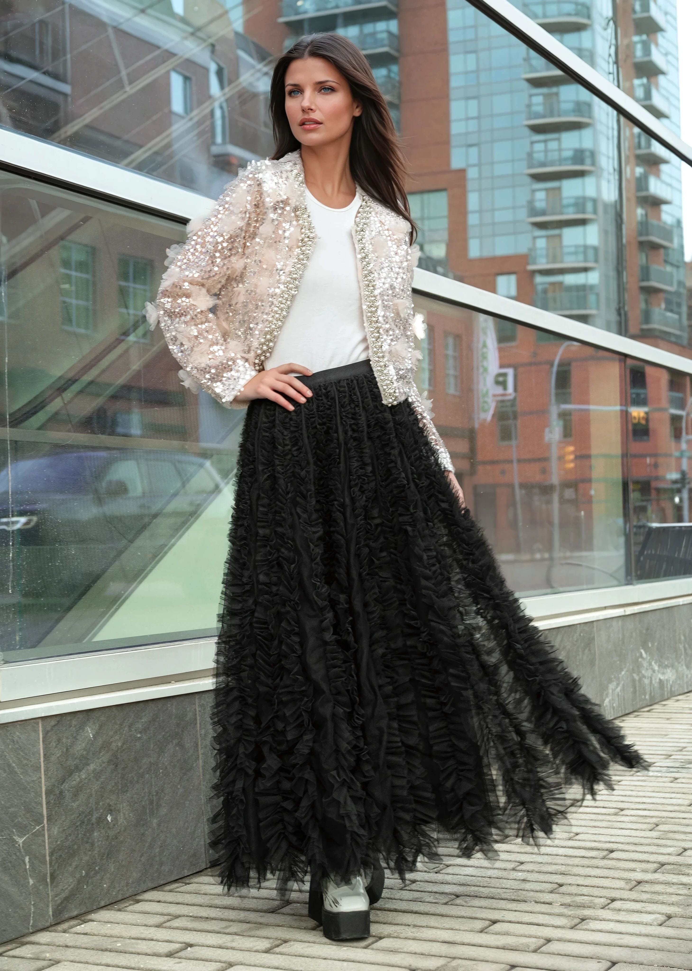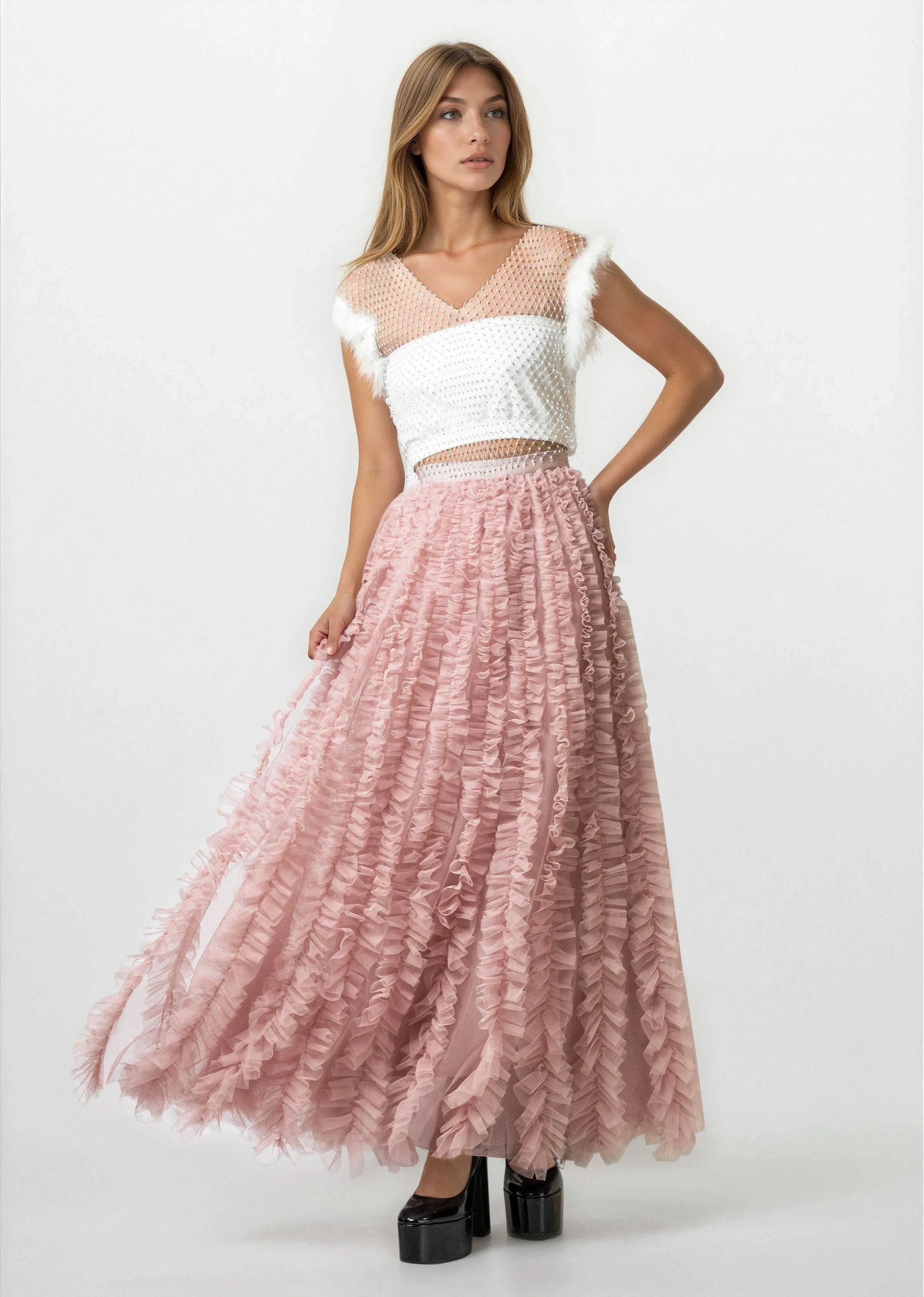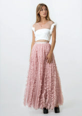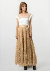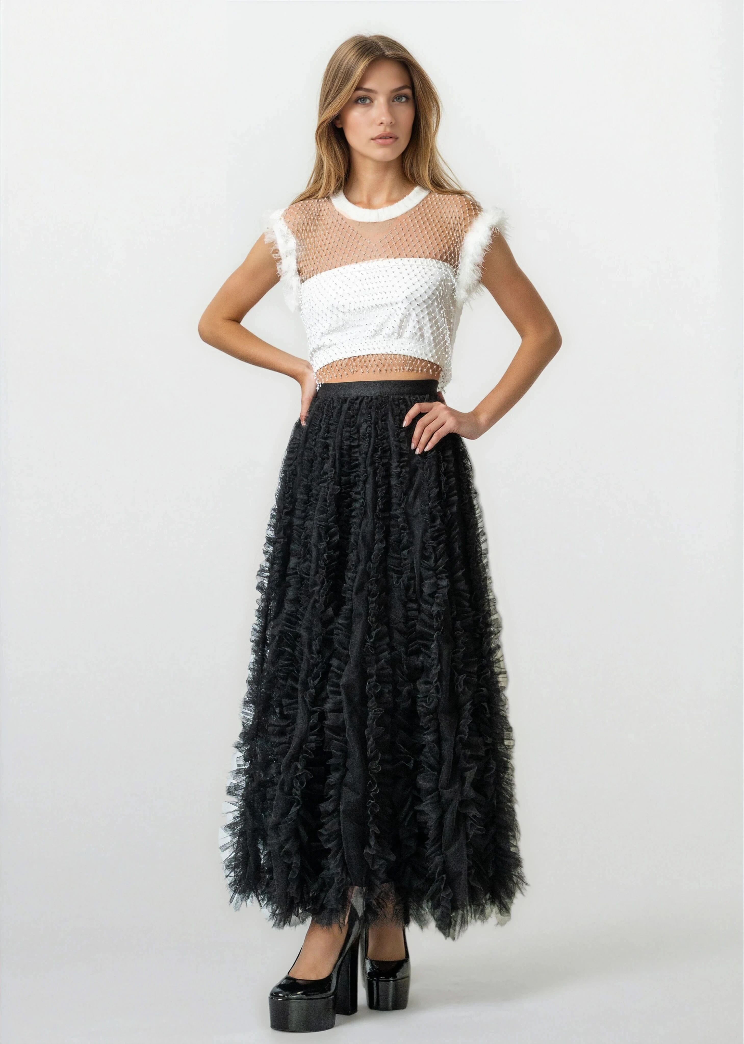 - Statement tulle skirt with layered ruffle texture that moves loud and unapologetic