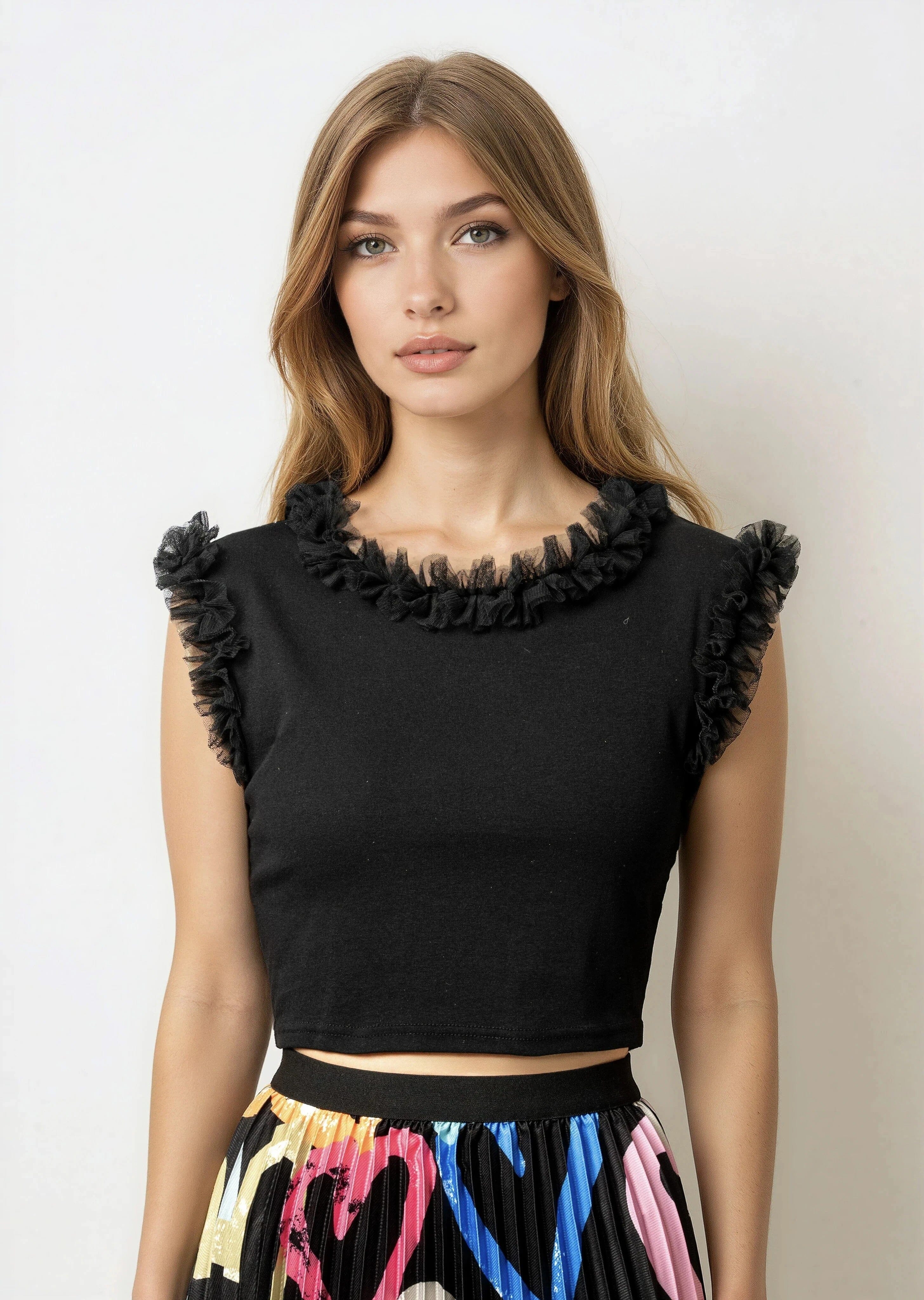 Tulle Trimmed Cropped Tank Top