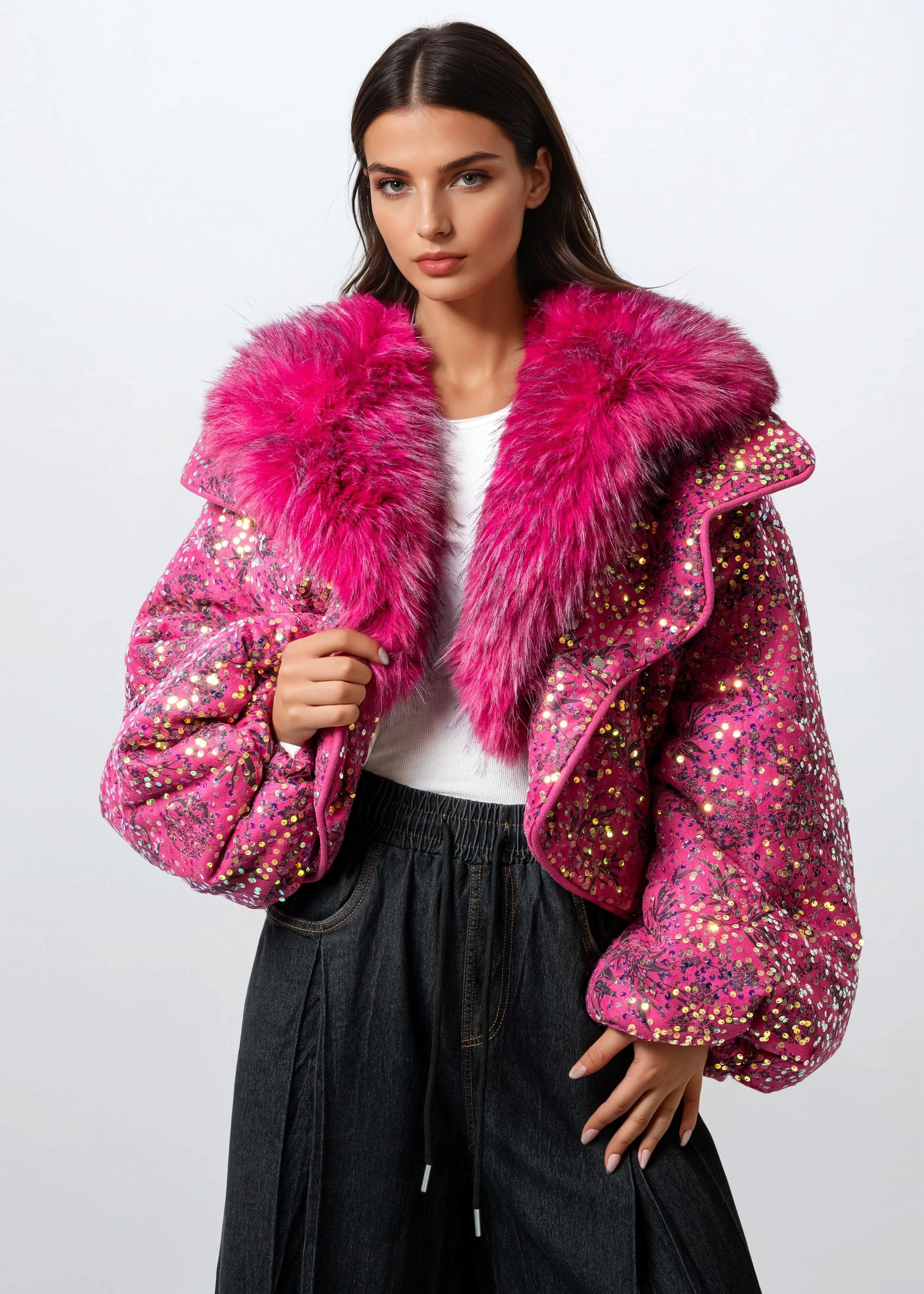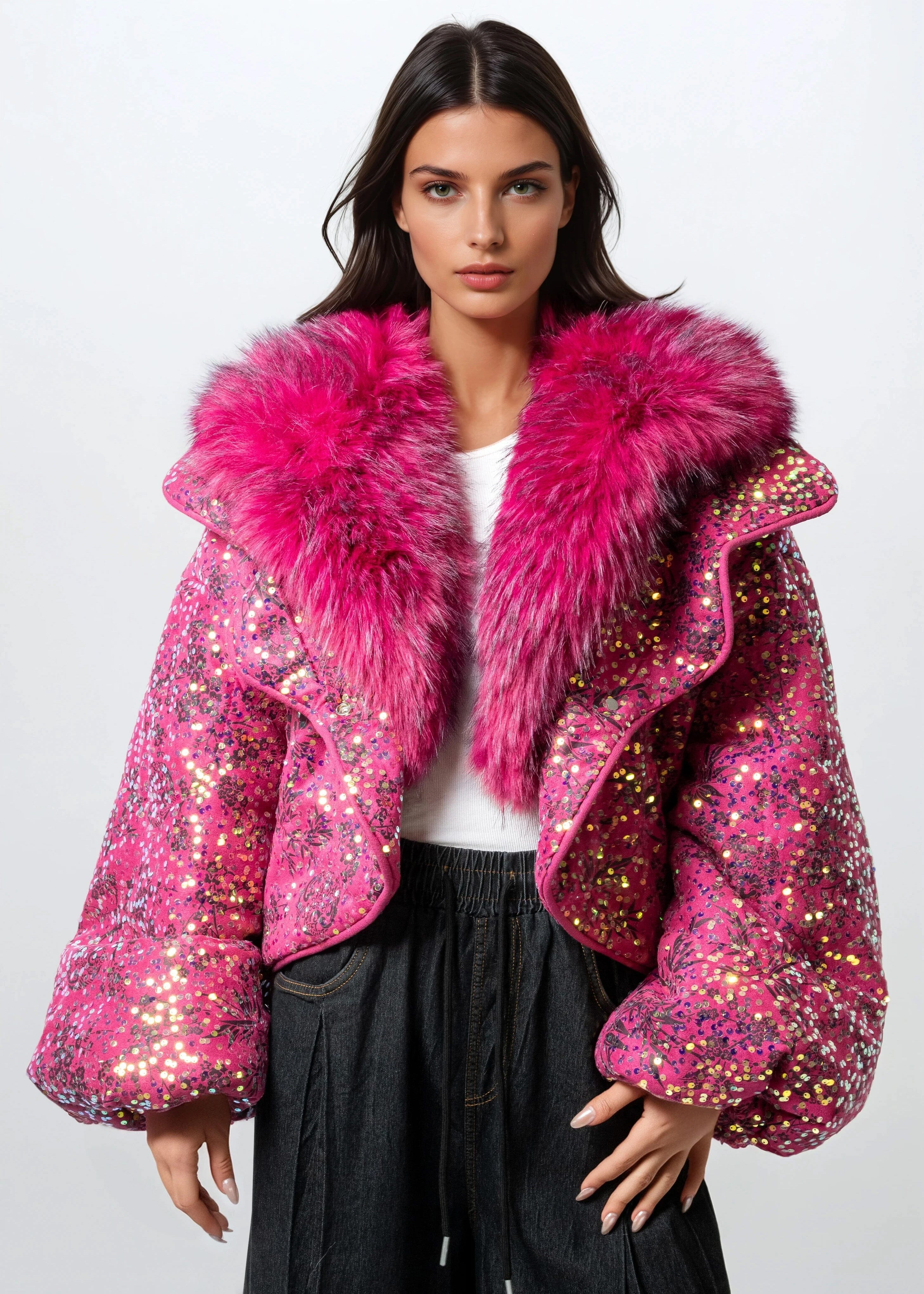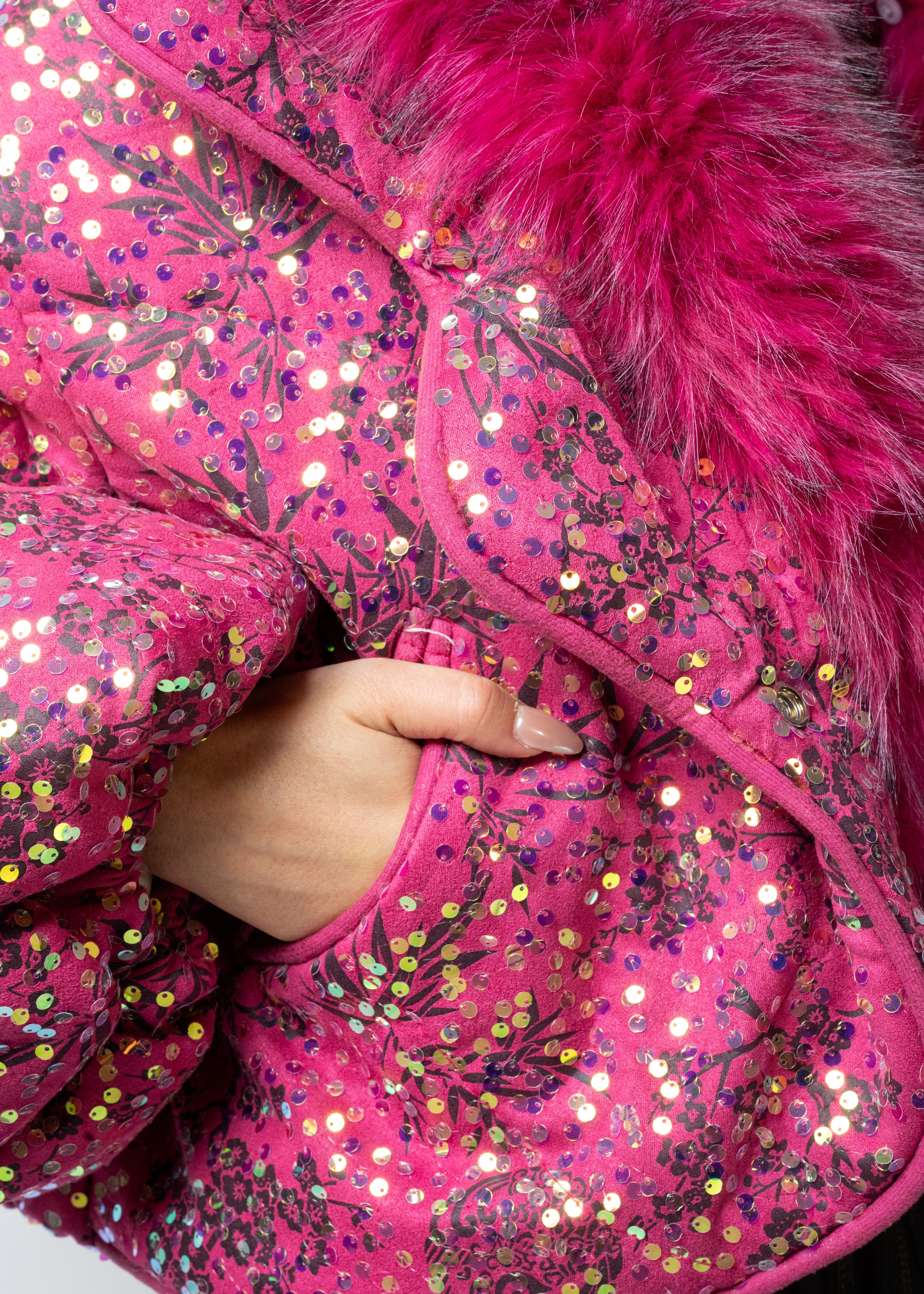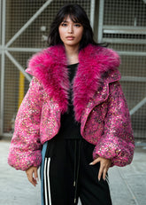 - Metallic sequin puffer with bold floral print