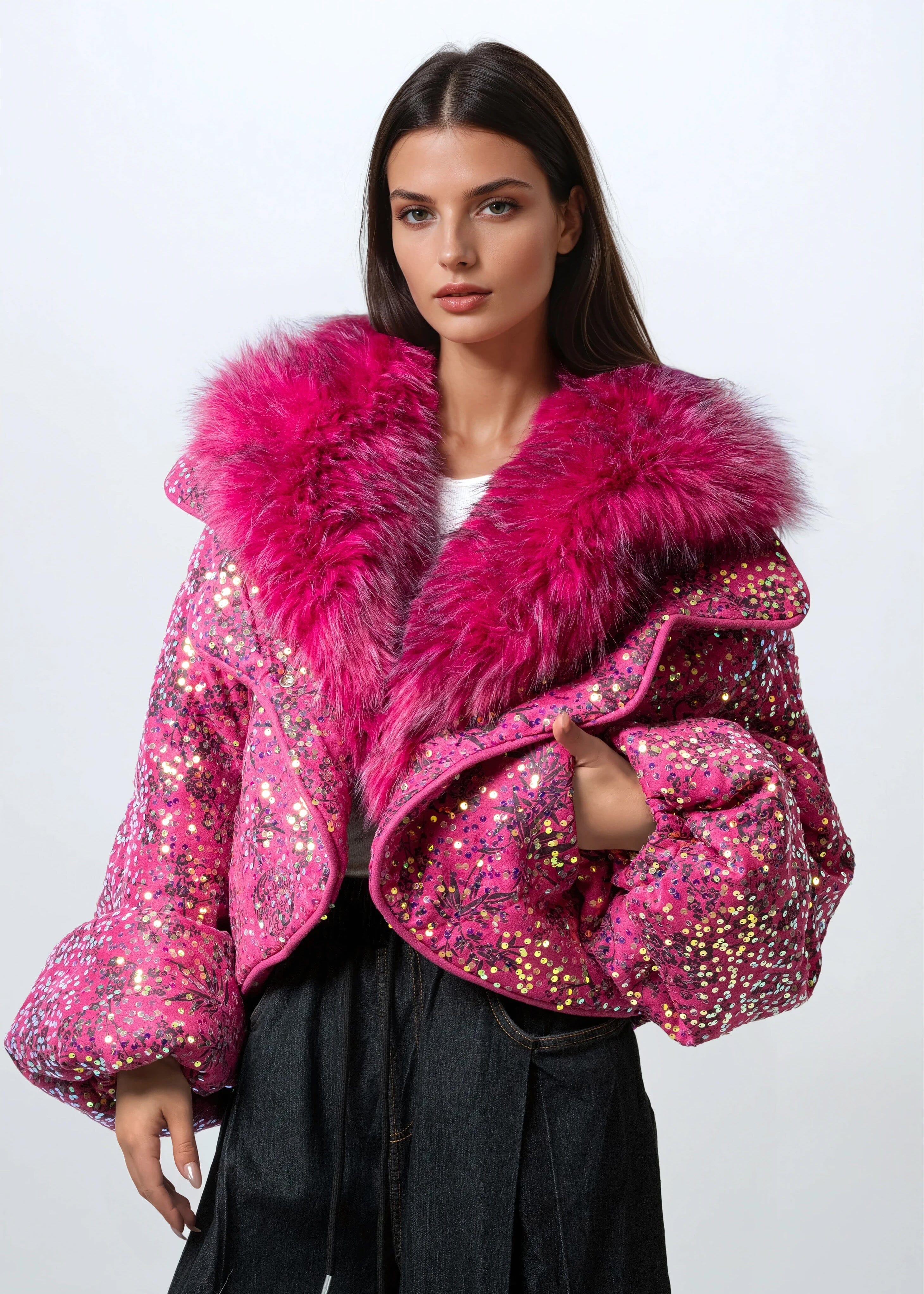 - Cropped, voluminous silhouette that commands attention