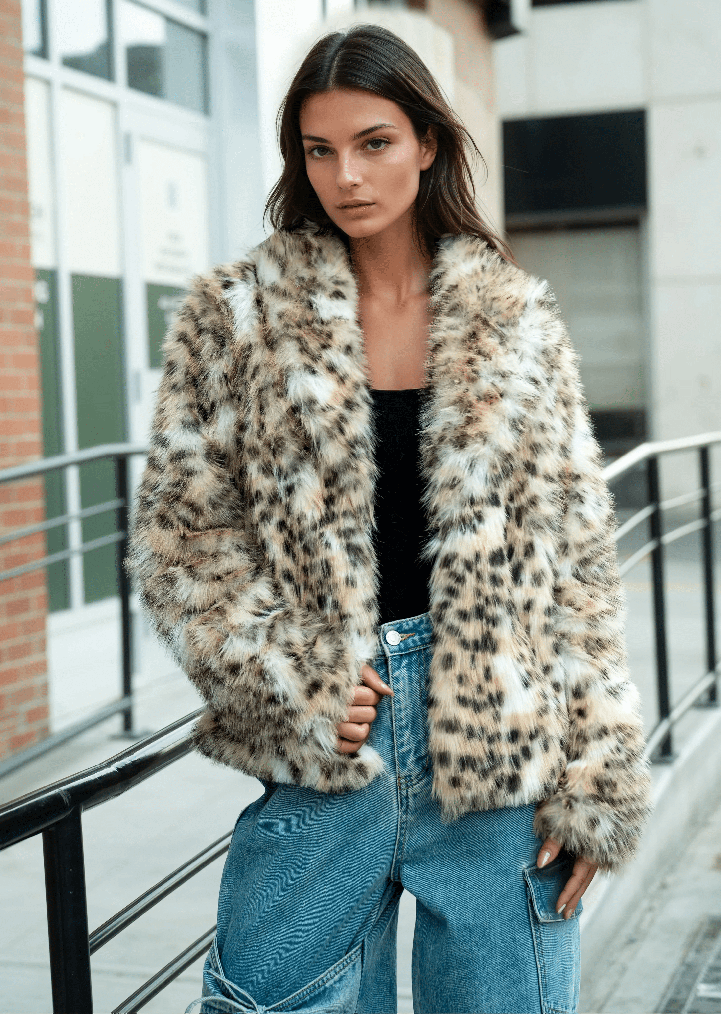 • Plush faux fur in snow-leopard print for instant luxe edge