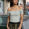 • Off-the-shoulder silhouette with built-in cups for confident, no-bra wear