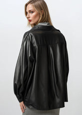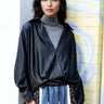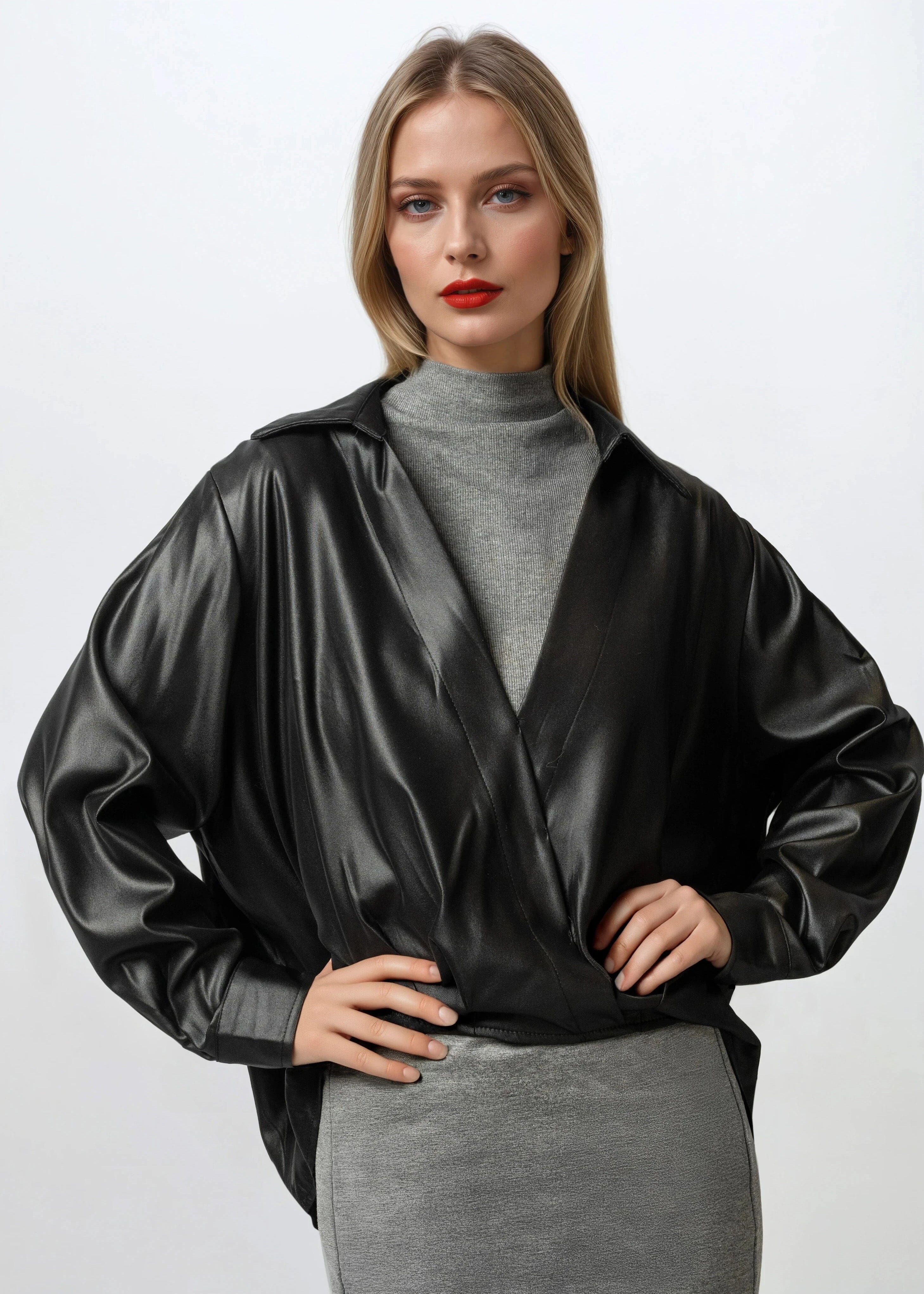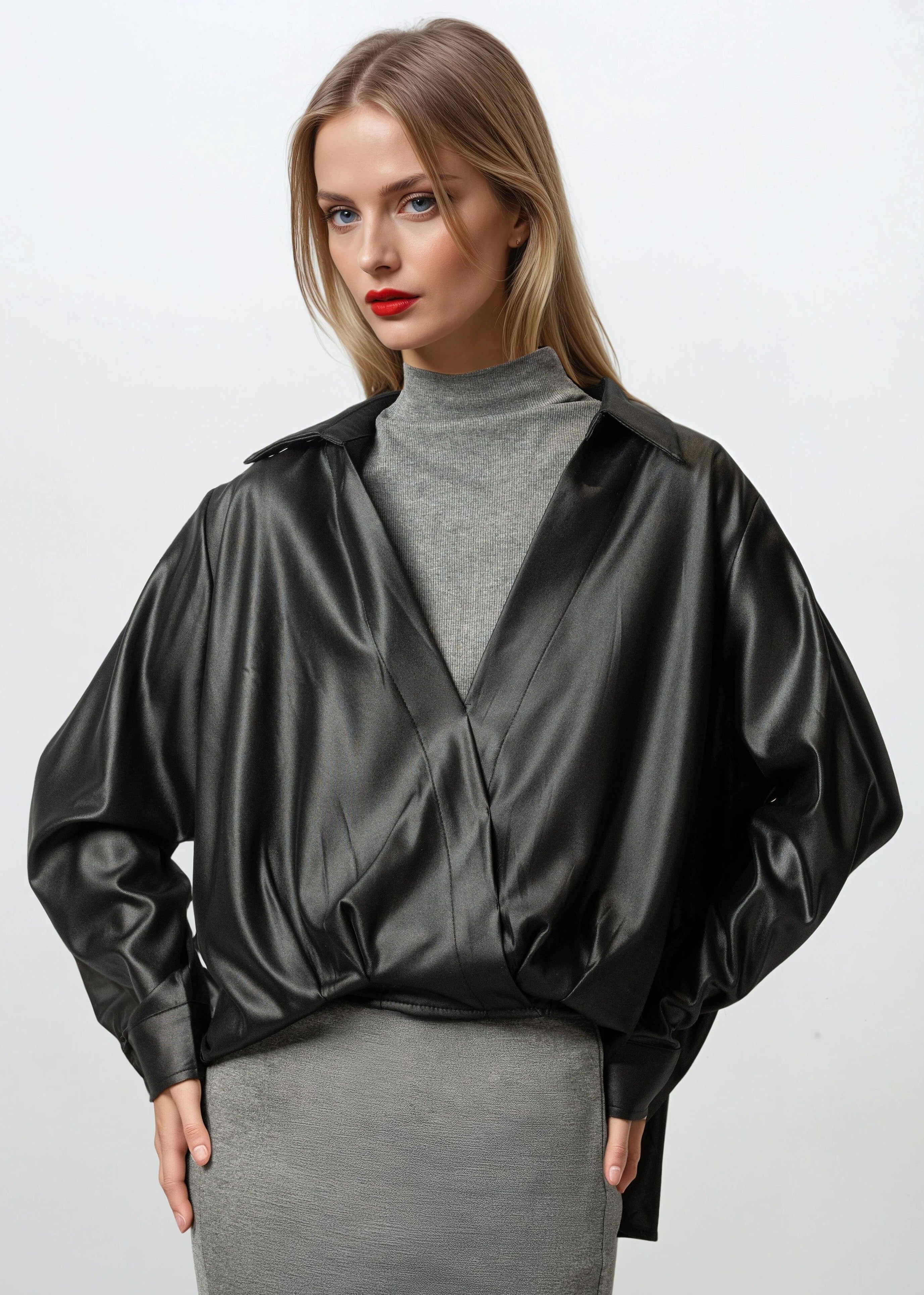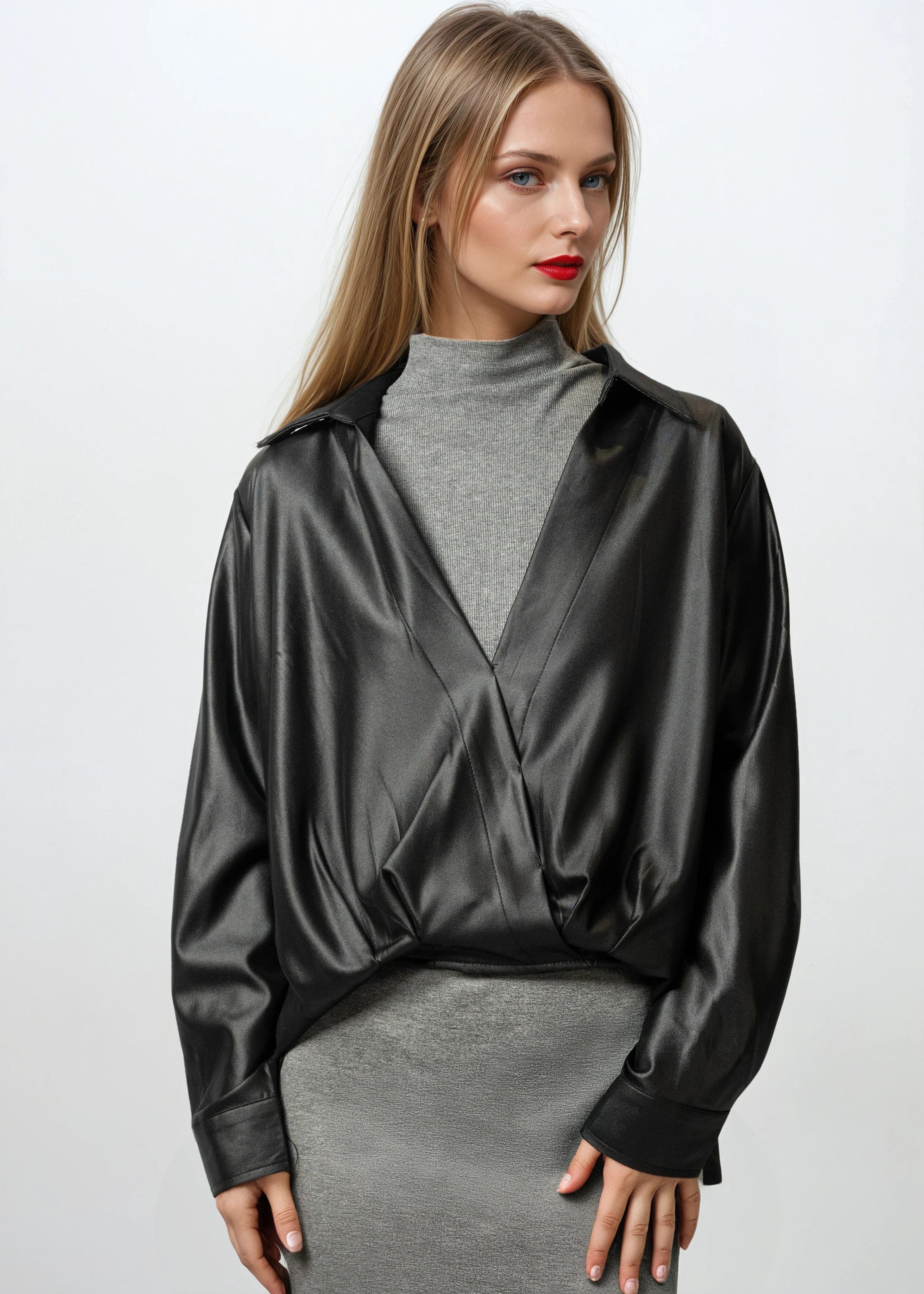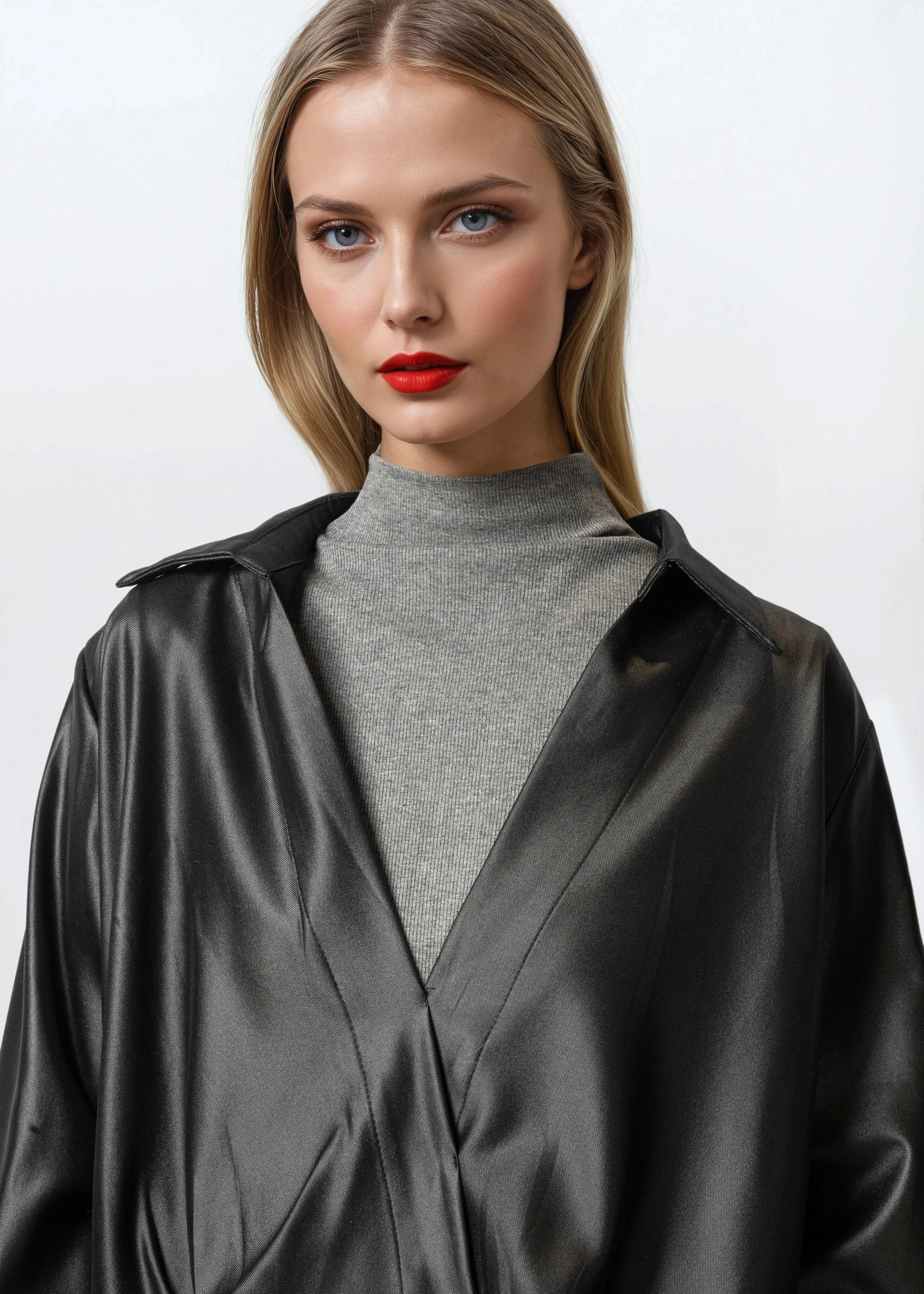 - Built-in turtleneck layered under a fluid blouse—no styling required