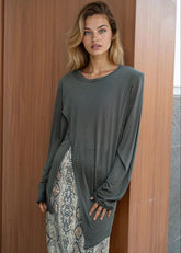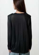 • Long sleeves with a relaxed, slouchy drape