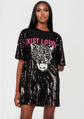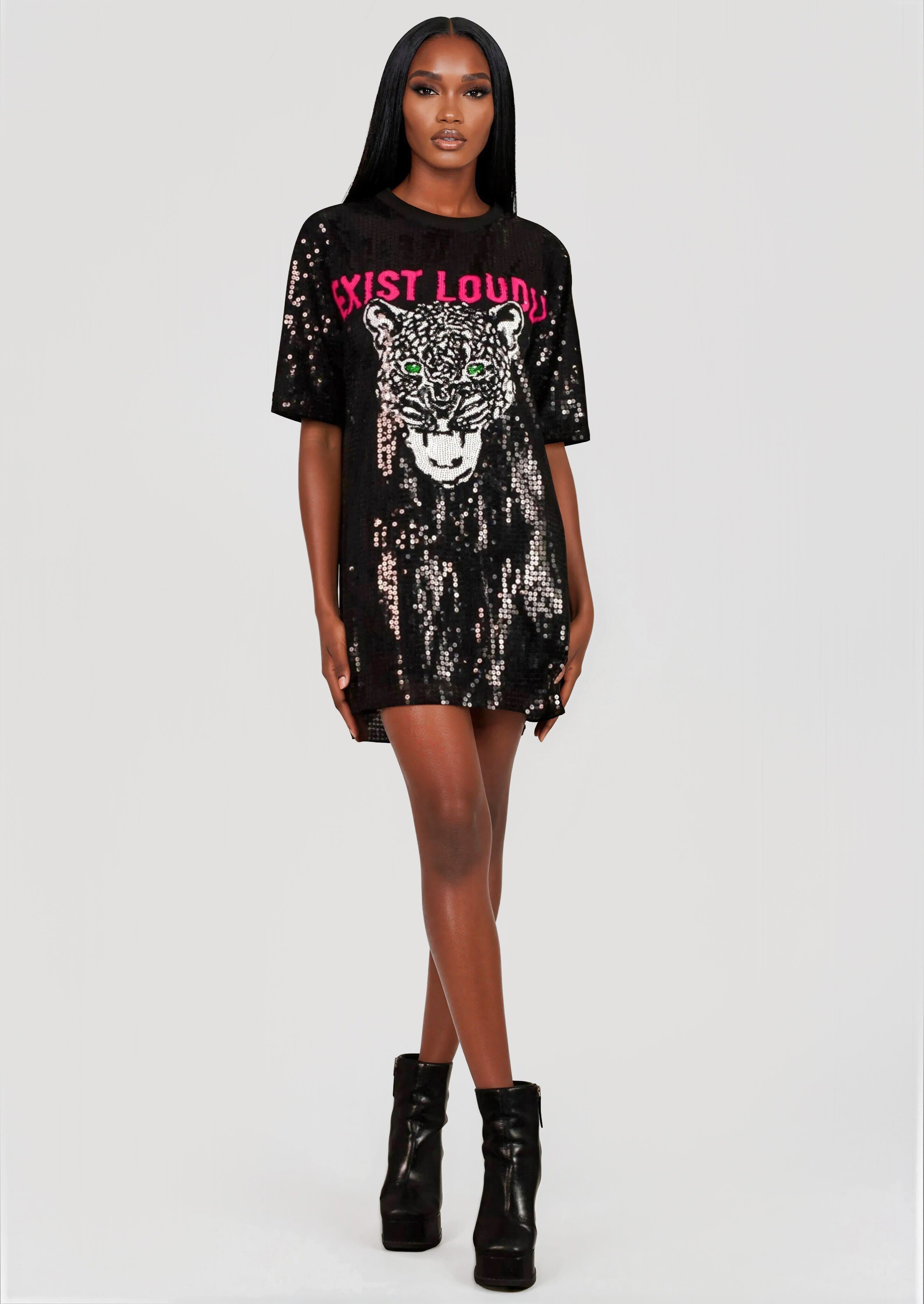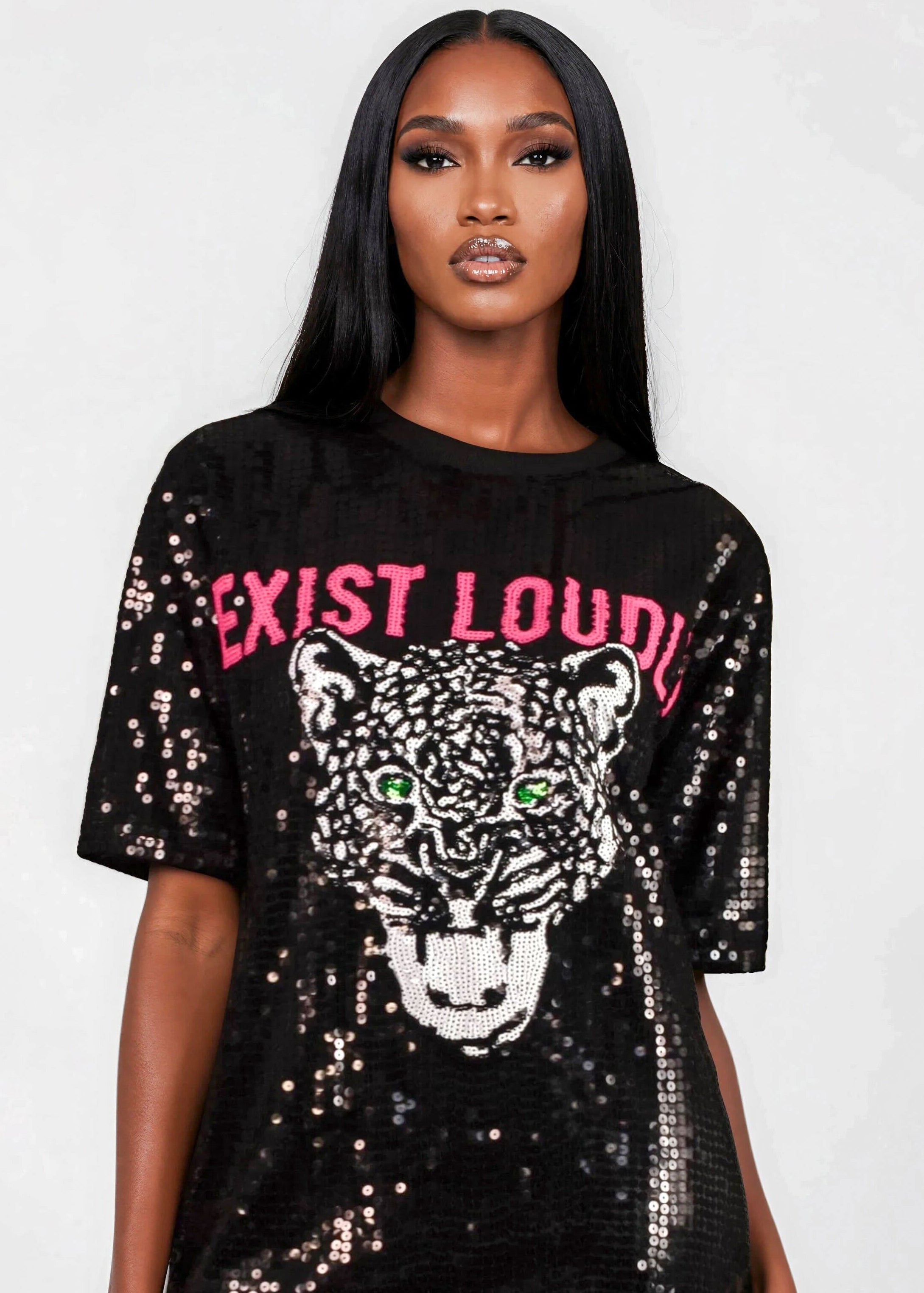 - Design: All-over black sequin base with a fierce leopard graphic motif, neon-green eyes, and a bold hot pink "EXIST LOUDLY" slogan.