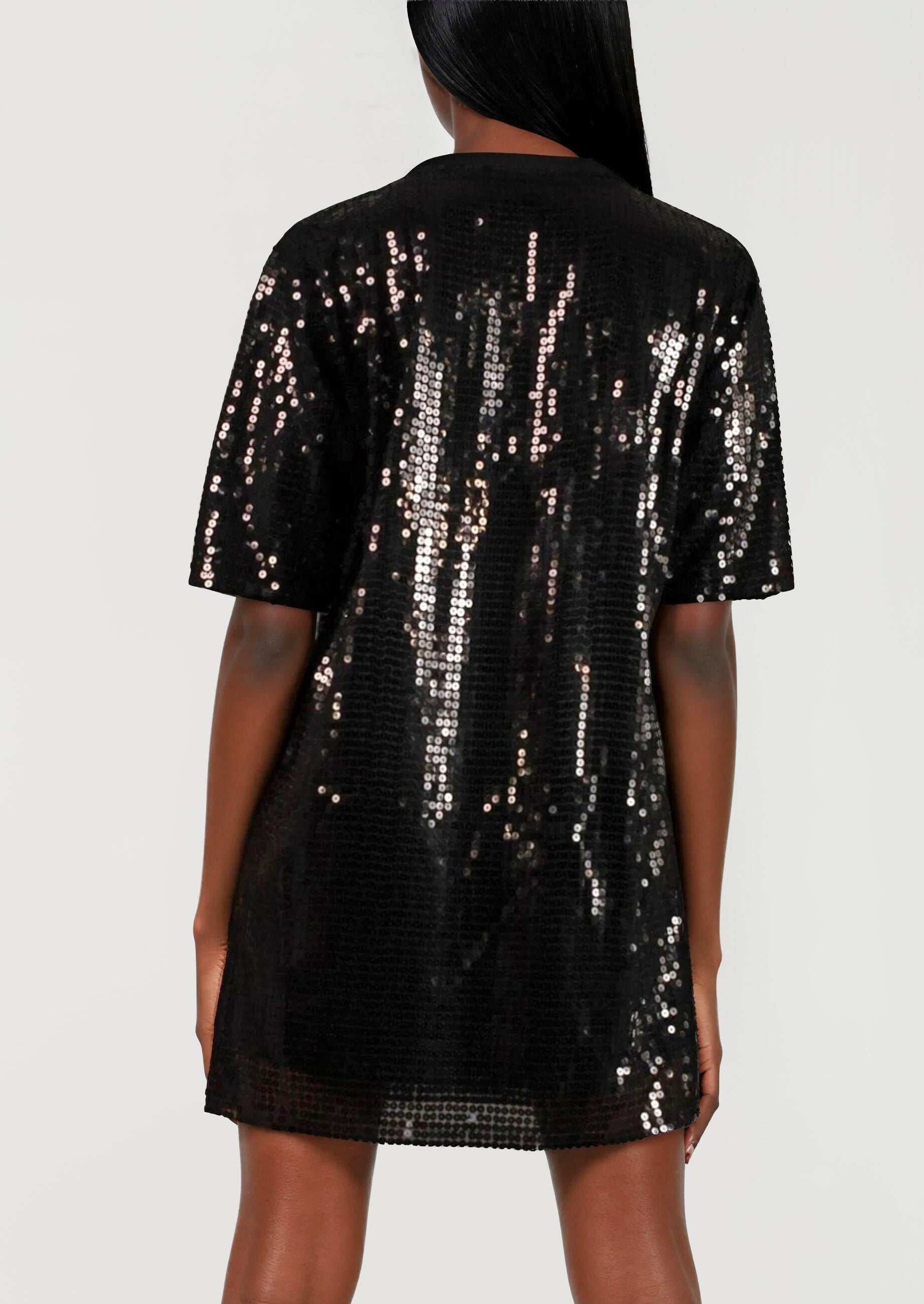 - Silhouette: Oversized tee dress — wears as a sequin mini dress or a statement oversized top.