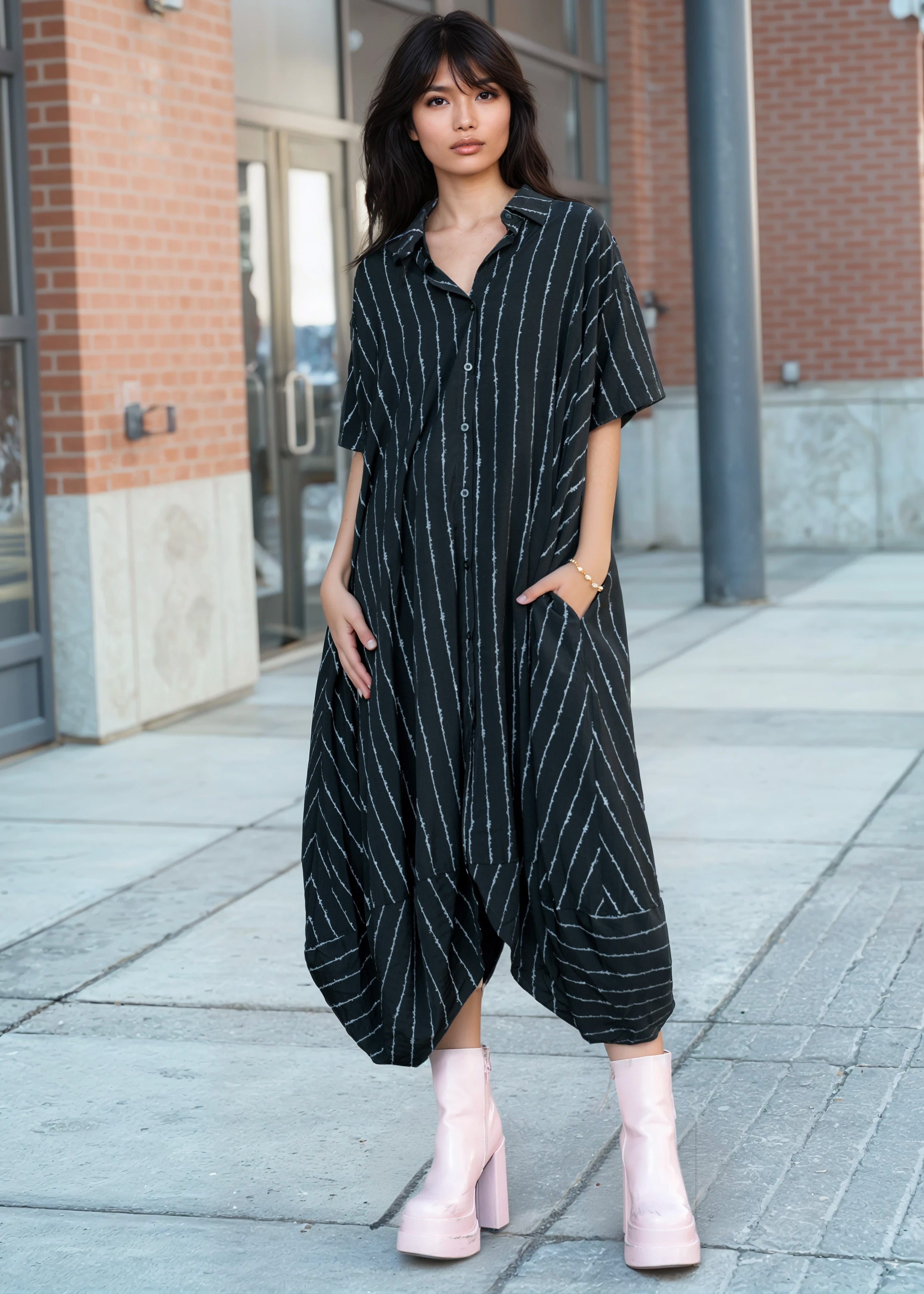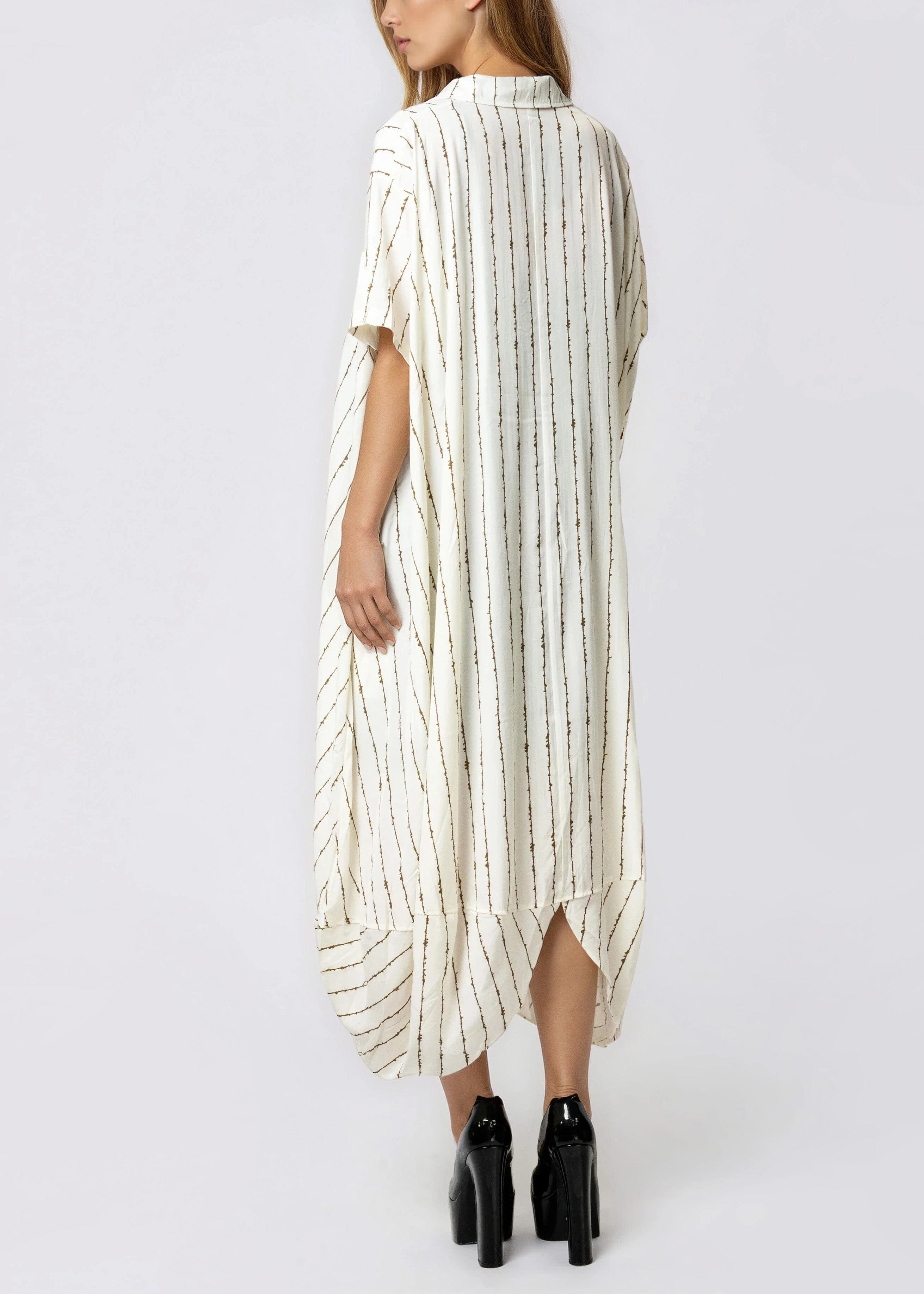 A button-up with bite. The all-over barbed wire stripe print says everything before you even open your mouth — wear it buttoned up as a midi dress or thrown open over a bodysuit and trousers. Drop shoulders, cocoon drape, curved high-low hem. This one plays by its own rules.